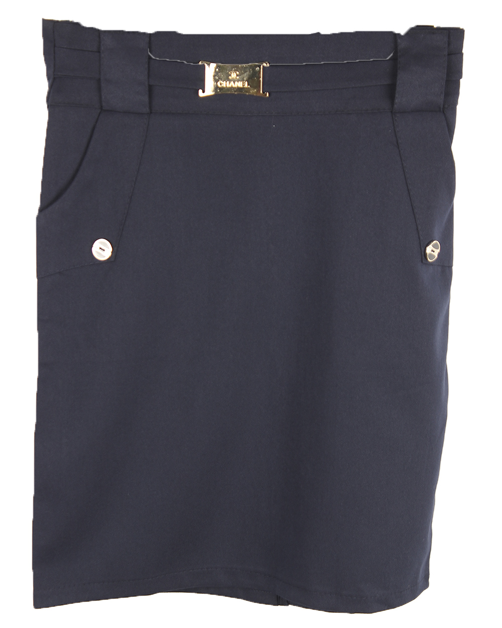 Юбка детская для девочки синего цвета, прямого кроя. Модель с украшением на передней части пояса.