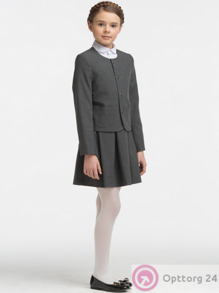 Классический жакет для девочек серого цвета с длинными рукавами, круглым вырезом. Модель имеет застежку на серых больших пуговицах. Спереди изделия накладные карманы.