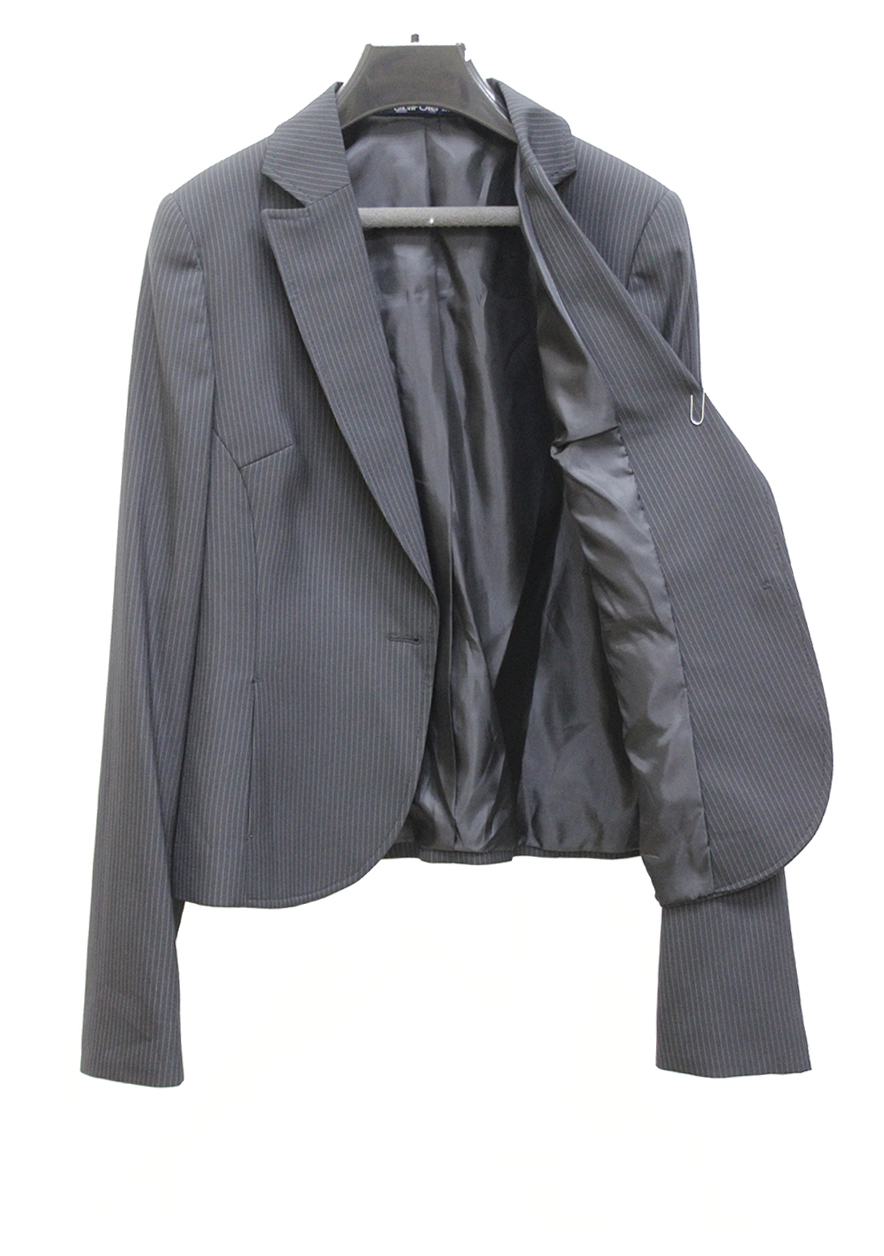 Описание: Жакет для девочки серого цвета в полосочку, приталенный.