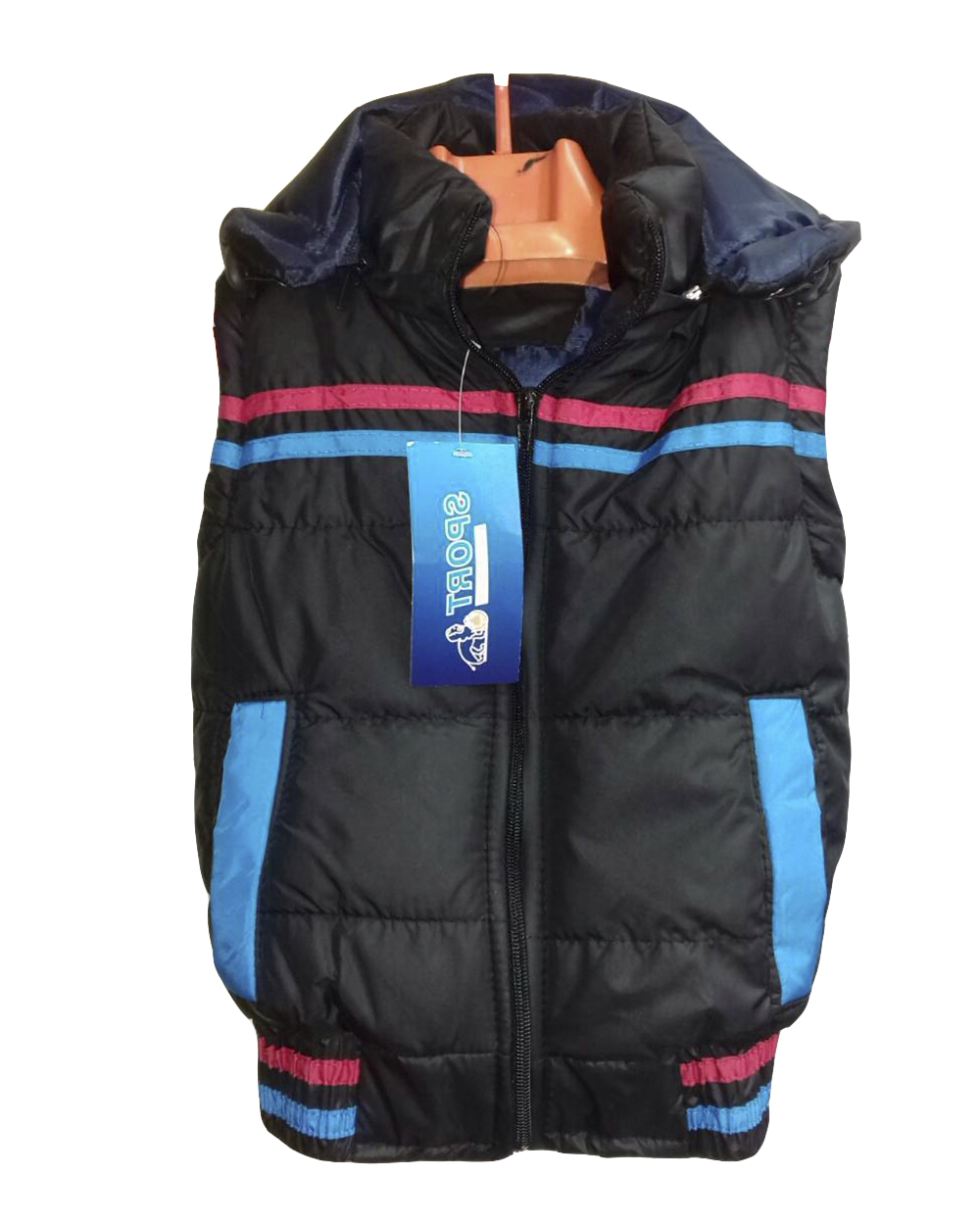 Жилет черного цвета с голубой и красной полоской оптом