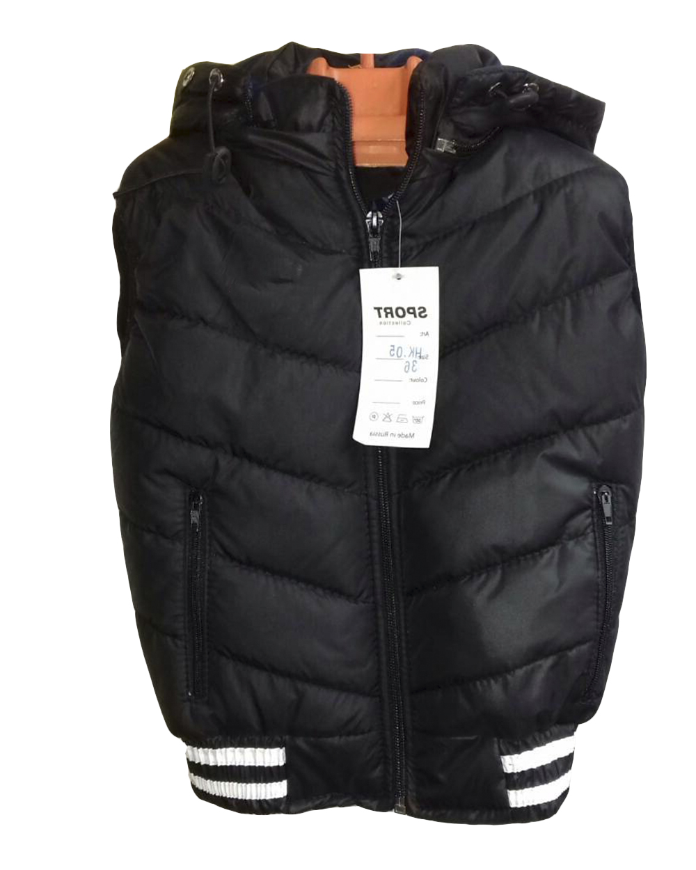 Модный дутый жилет с отстегивающимся капюшоном. Пройма и низ изделия имеют утягивающую резинку.