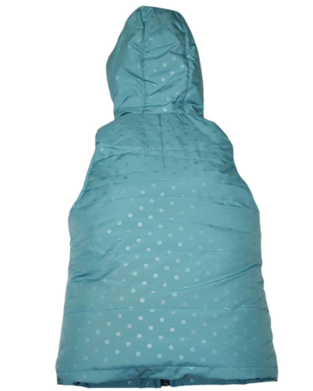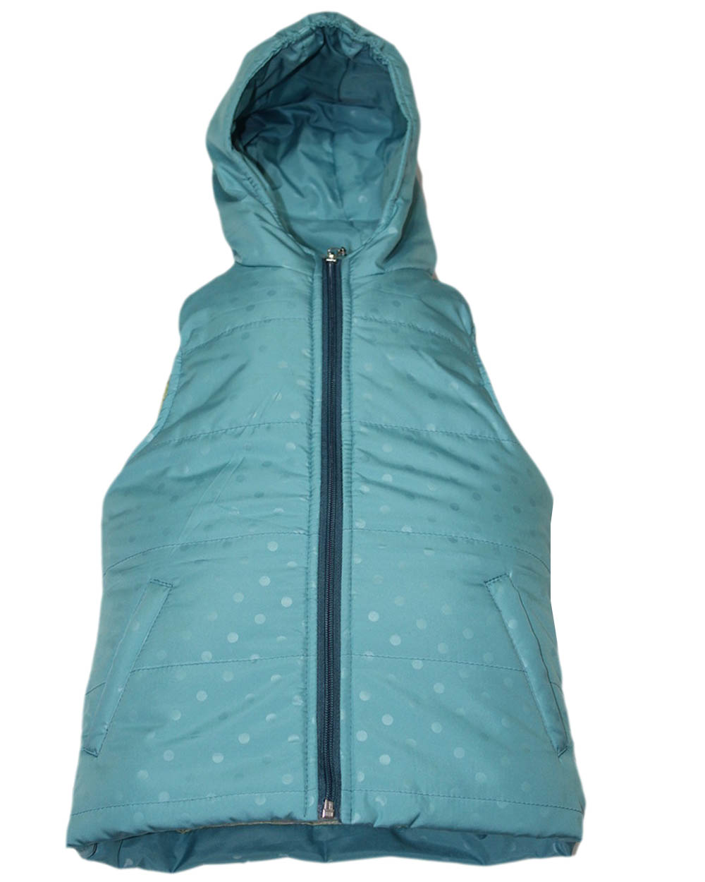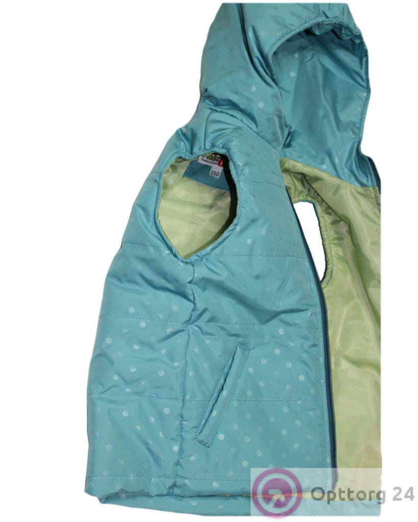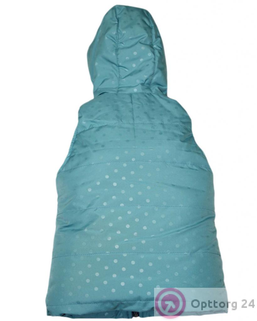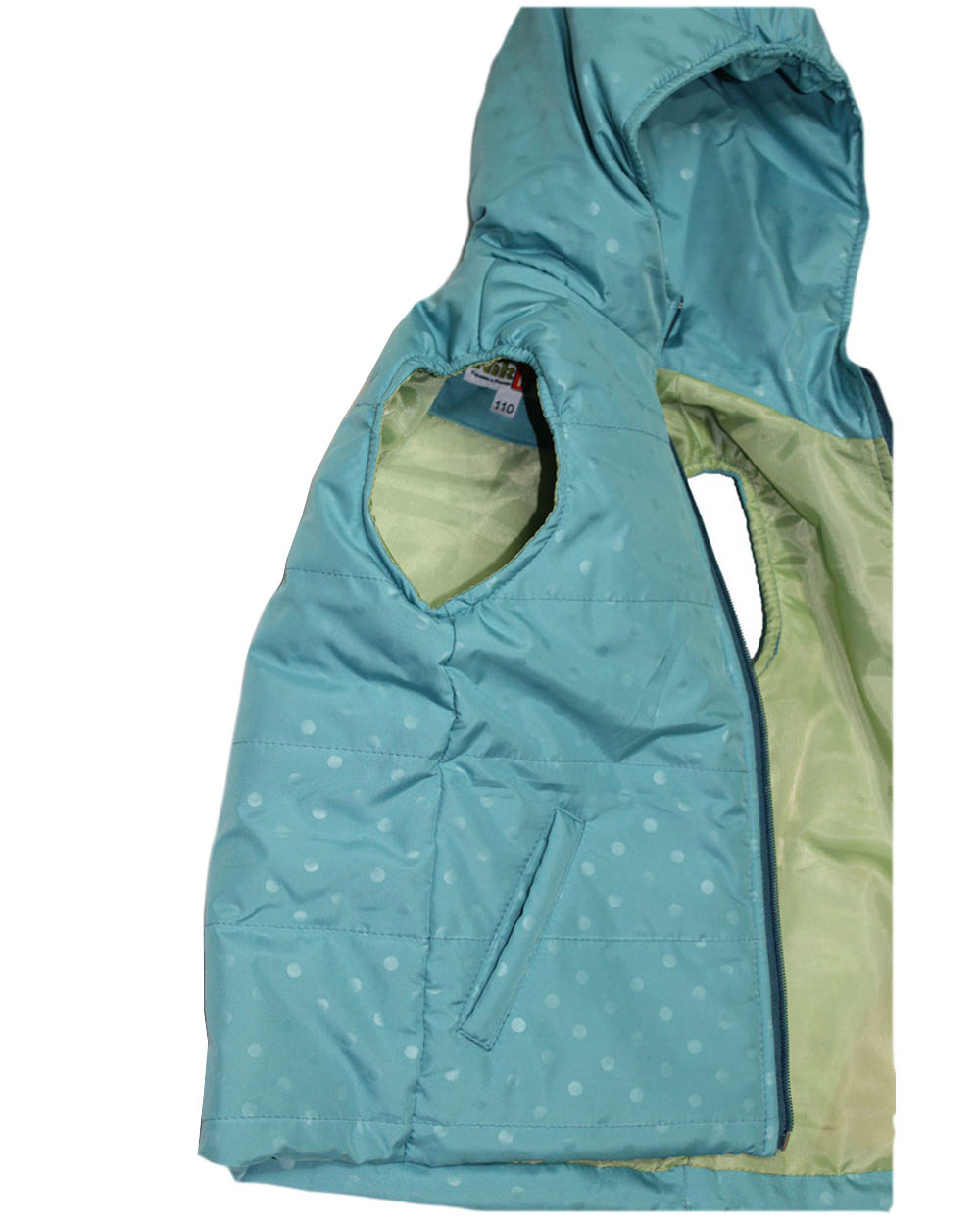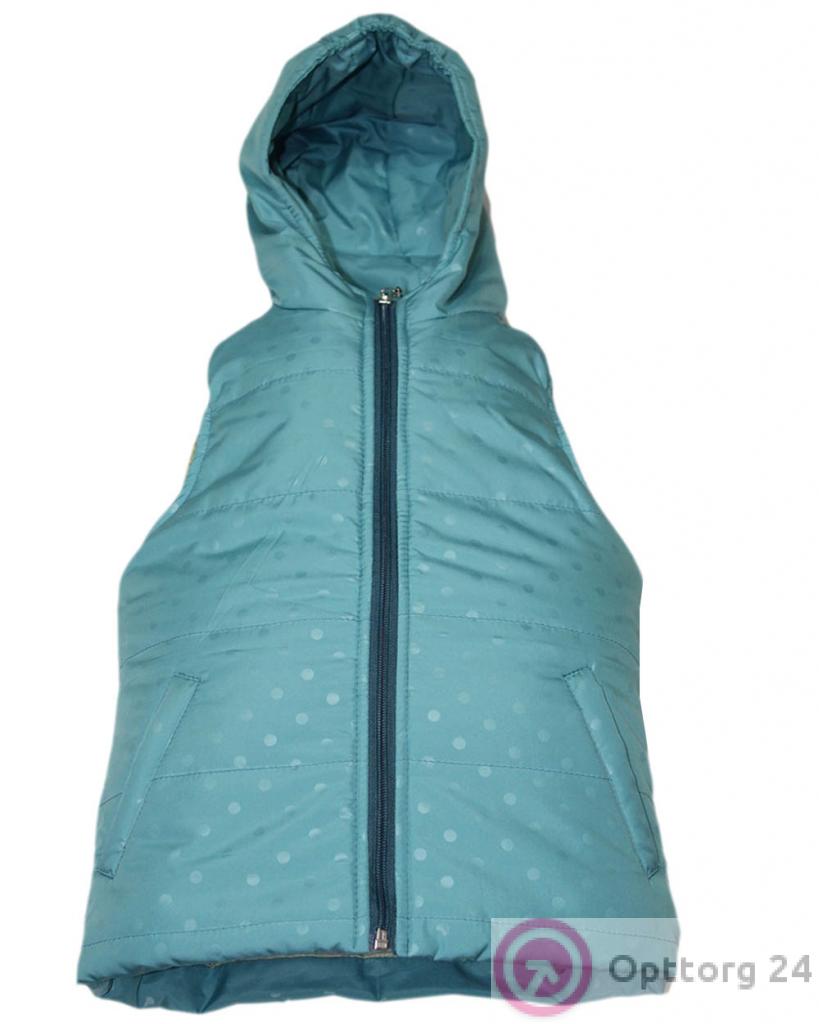 Утепленный детский жилет цвета морской волны с принтом в горохи. Модель имеет капюшон, который не отстегивается. Застегивается сперди на молнию. Ткань верха- Дюспо, Политафета с водоотталкивающими свойствами.