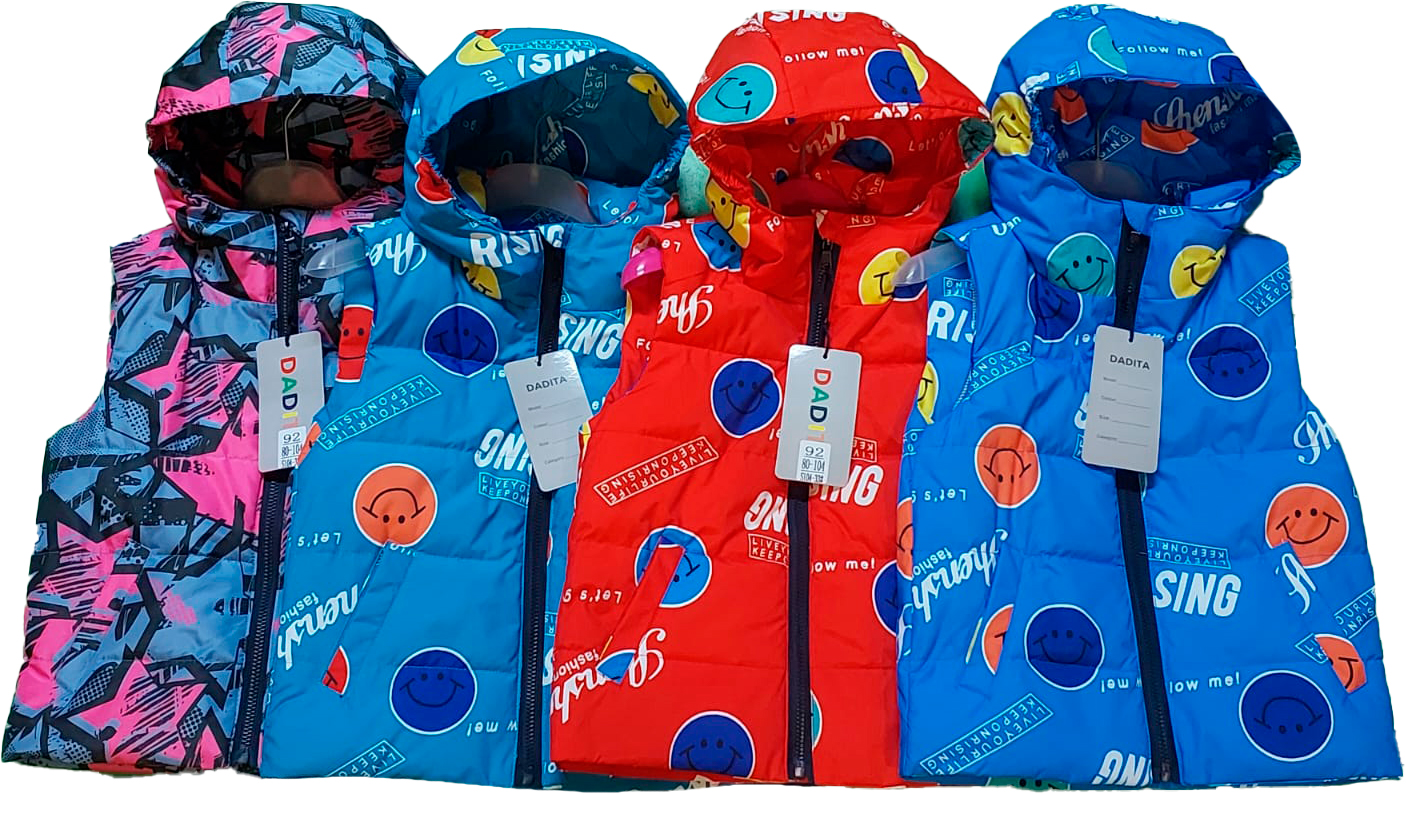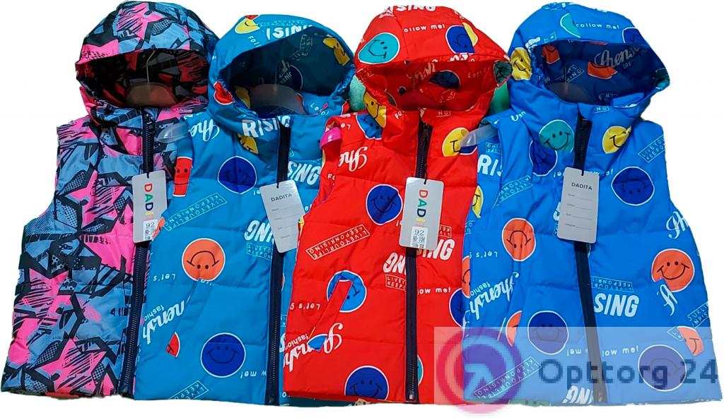 Описание: Жилет детский на синтепоне DADITA, фабричного производства, с логотипом и капюшоном, разноцветные. Застегивается на молнию.