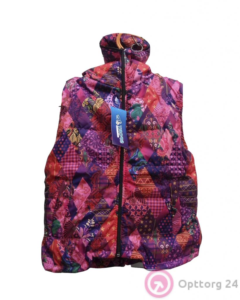Мягкая утепленная жилетка с оригинальным дизайном. В модели предусмотрен капюшон. Изделие дополнено двумя карманами.