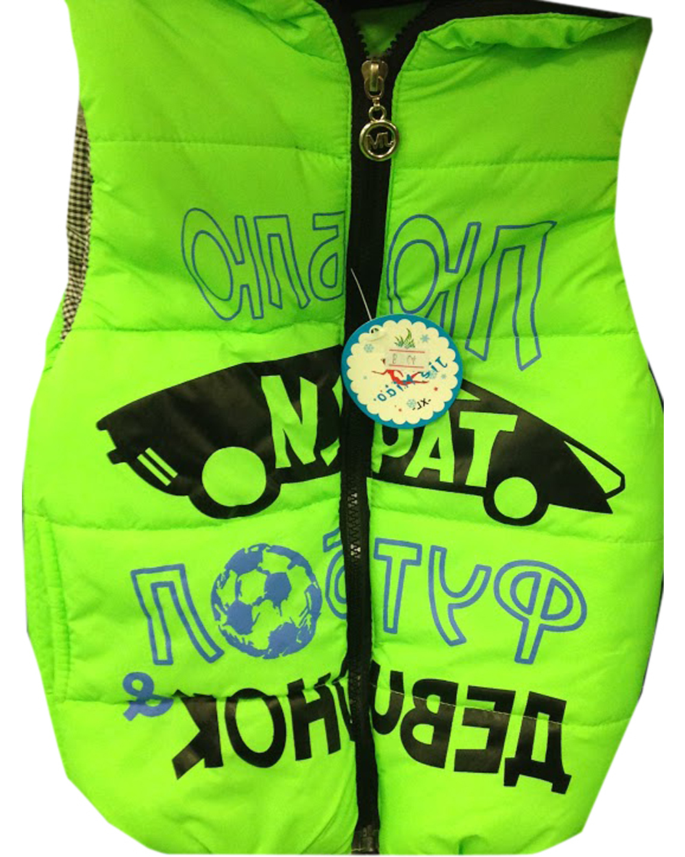 Модная стеганая жилетка для мальчика, утепленная синтепоном. Изделие выполнено в салатовом цвете с принтом и деталями черного цвета. Модель застегивается на молнию.