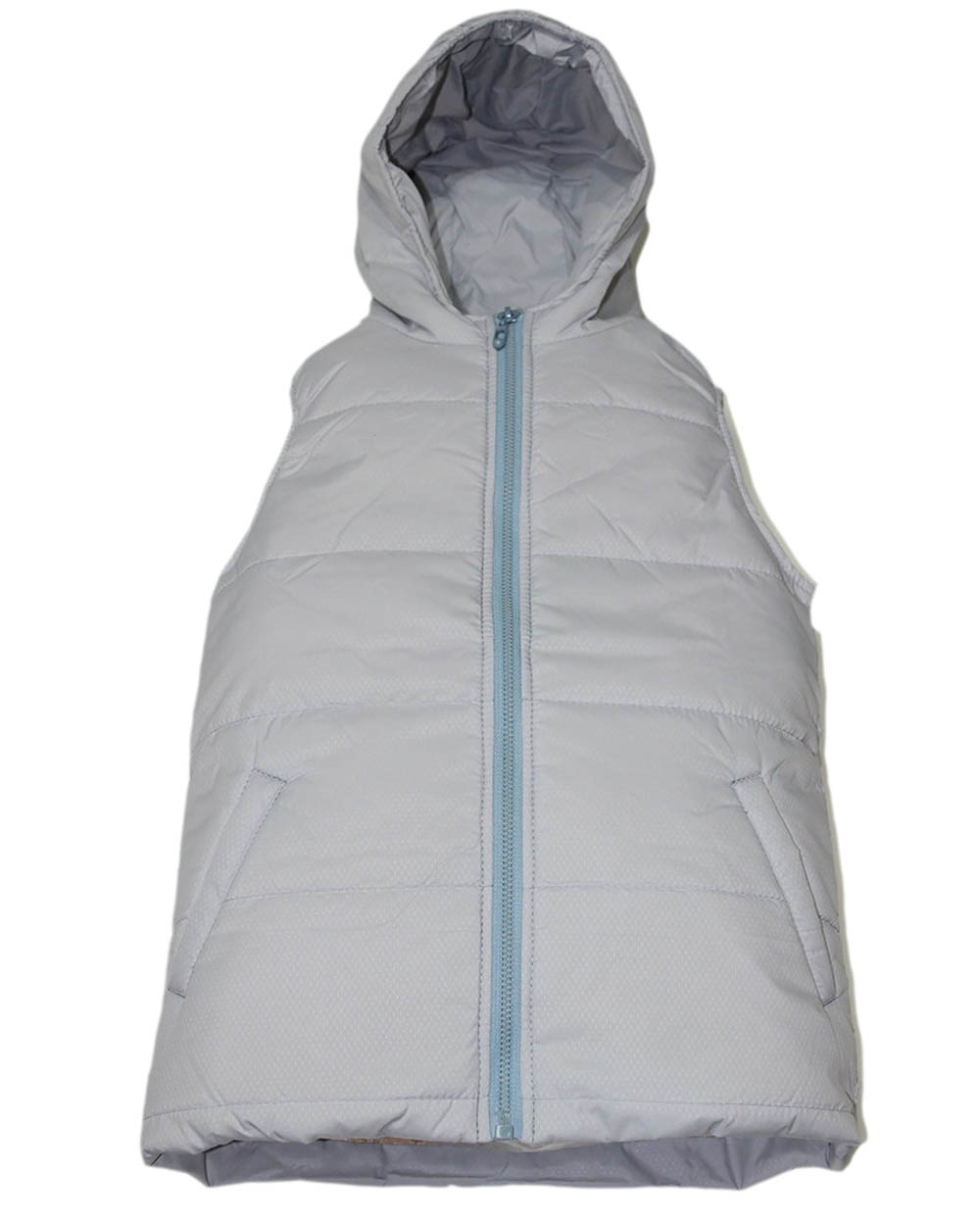 Детский жилет с капюшоном. Модель выполнена в белом цвете и имеет горизонтальную прострочку.
