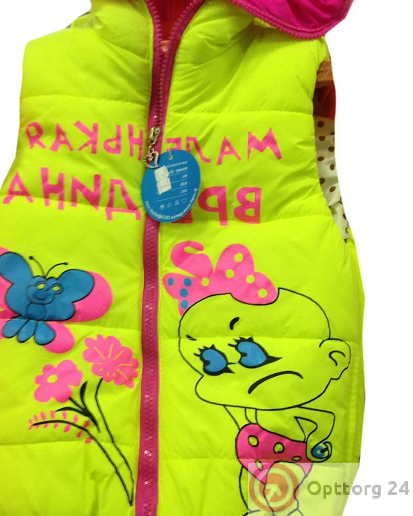 Утепленный детский жилет для девочки в возрасте от 3 до 7 лет. Модель выполнена в ярком желтом цвете с нанесенным принтом с надписью "Маленькая вредина". Застежка сделана в виде молнии розового цвета.