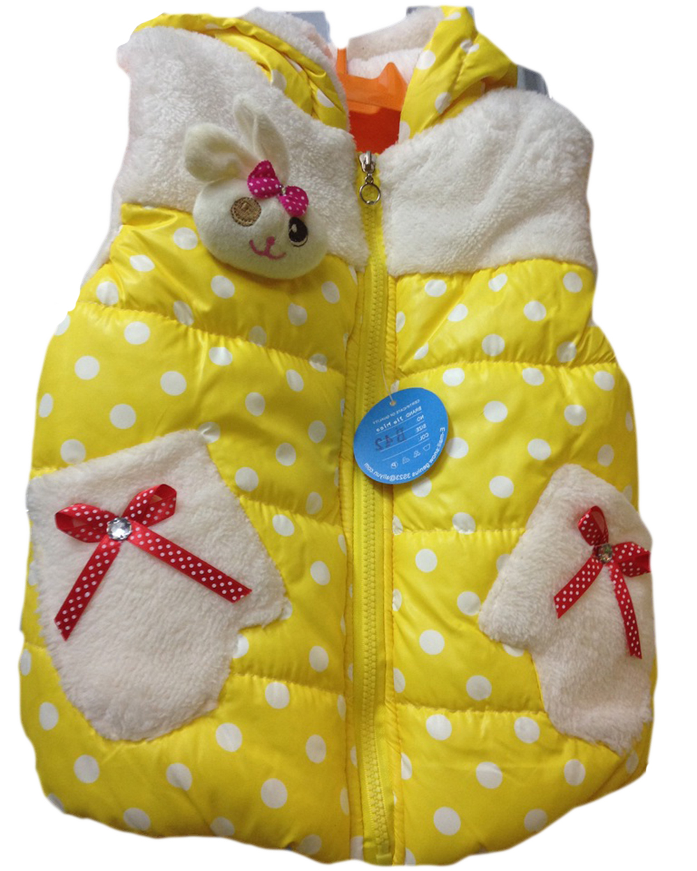 Симпатичный утепленный жилет на девочку желтого цвета в милый горошек. Накладные открытые карманы и низ изделия сделаны из плюшевого материала, очень приятного на ощупь. На кармашках пришиты маленькие красные бантики, на груди голова зайчика. Сам жилет застегивается на молнию.