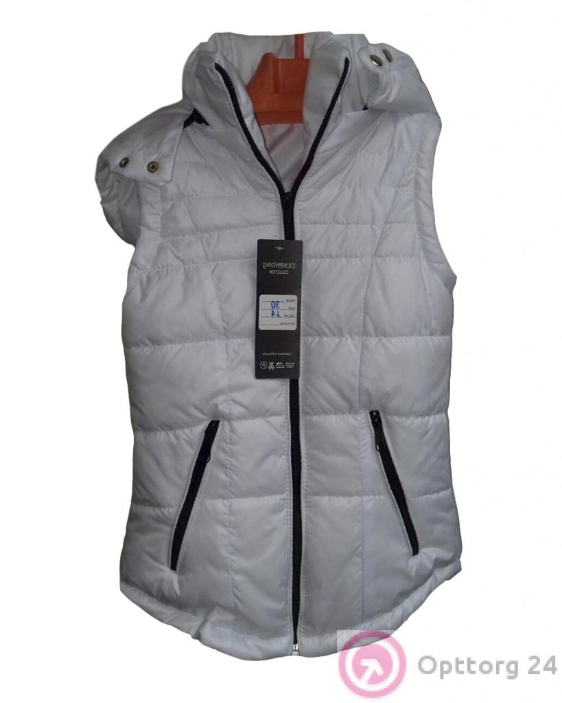 Прекрасный белый жилет с капюшоном. Украшают модель контрастные черные молнии.