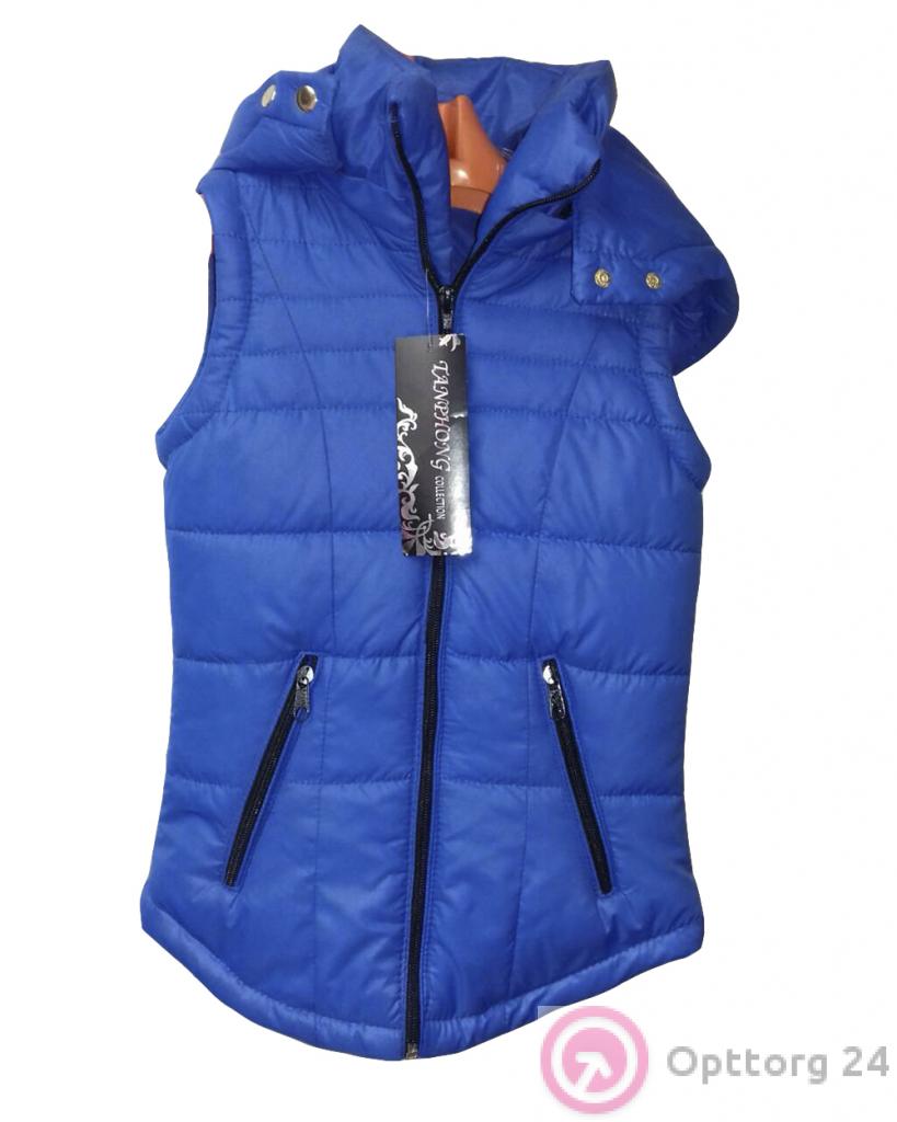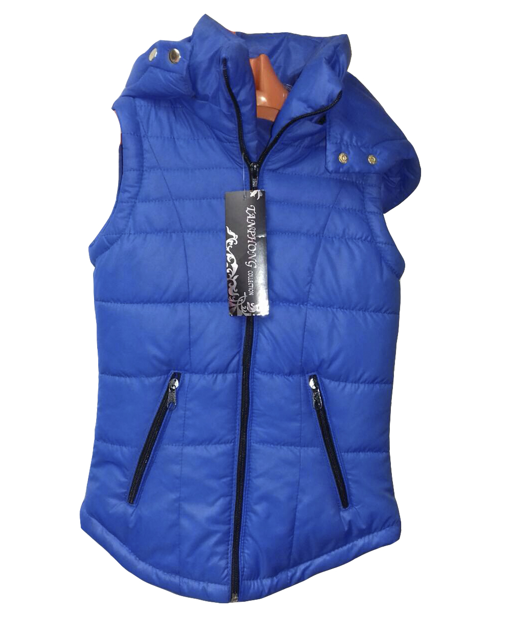 Стеганый жилет для девочки. Насыщенный синий цвет. Есть капюшон, а также воротник-стойка.