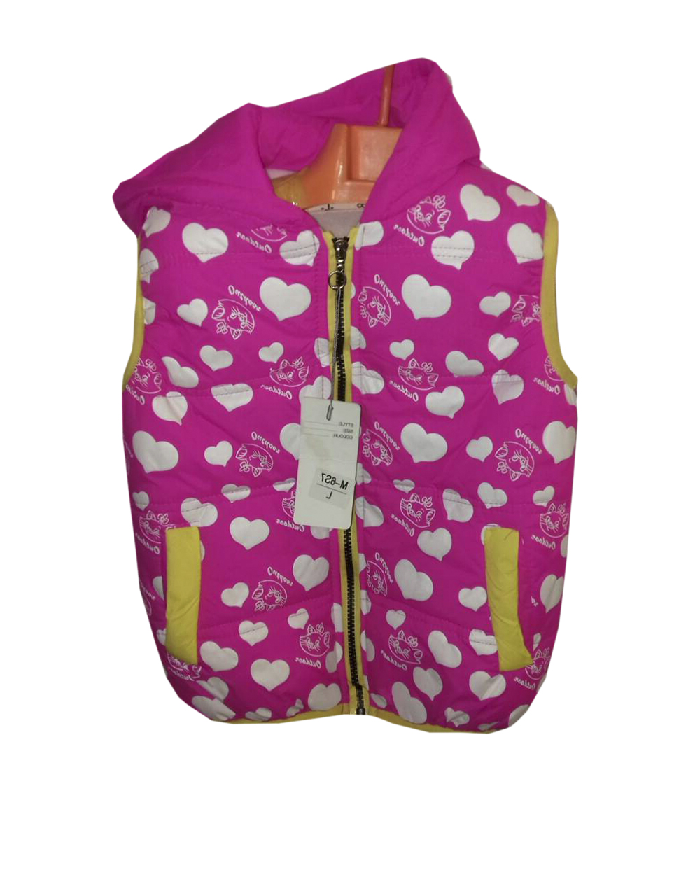 Модный детский жилет яркой фиолетовой расцветки. Изделие имеет центральную застежку-молнию, а также два кармана с контрастной желтой окантовкой.