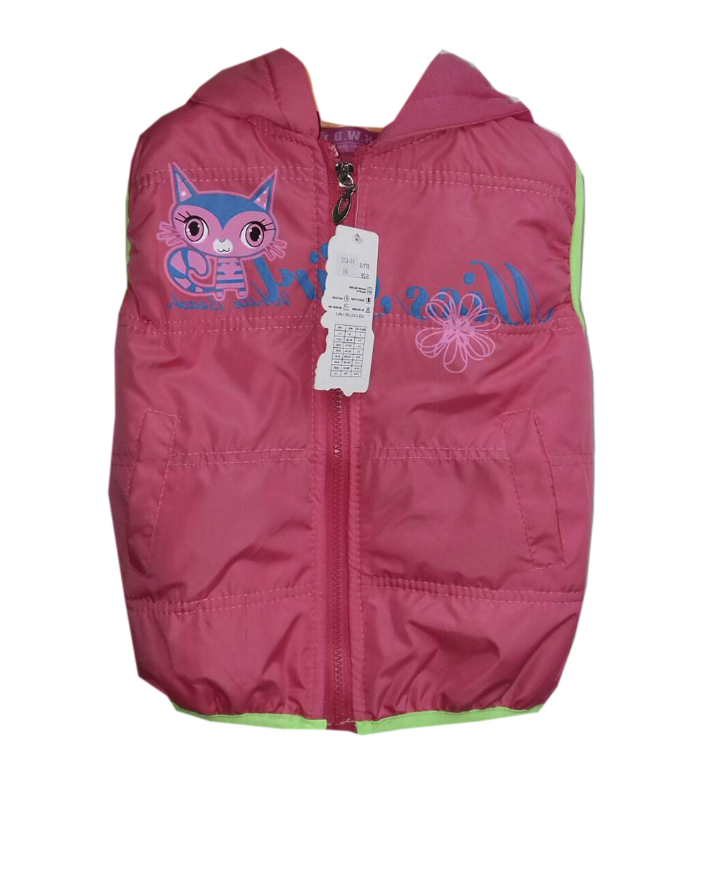 Мягкий утепленный жилет из стеганого полиэстера. Модель украшена изображением милой кошечки и большой надписью на груди.