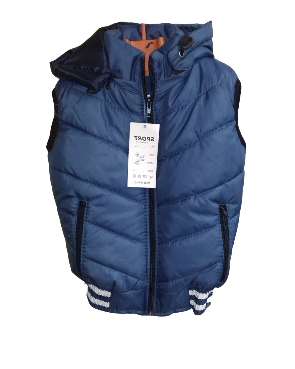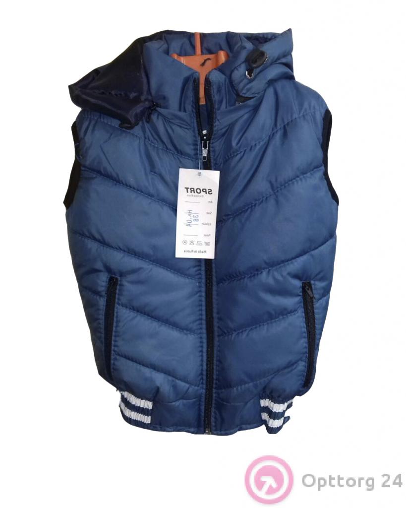Стеганый жилет насыщенного синего цвета. Подкладка и капюшон изнутри темно-синего цвета. Застежка - молния, карманы также на молнии.