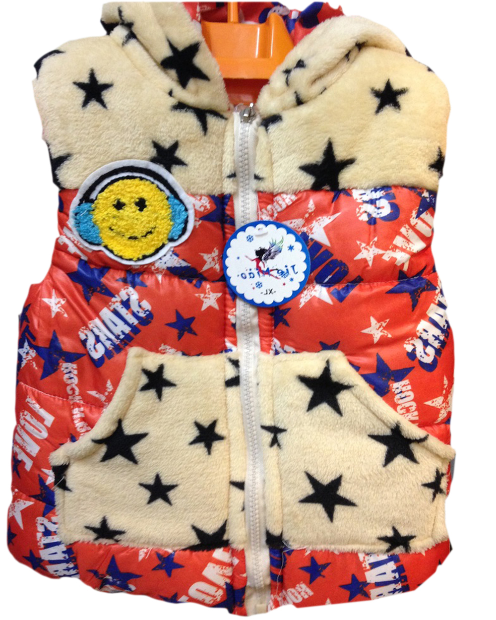 Очень красивая теплая жилетка с капюшоном для детей от 3 до 7 лет. Модель застегивается на молнию, верх изделия и карманы сделаны из плюшевой ткани бежевого цвета со звездами. Низ жилетки красный с принтом в виде букв.