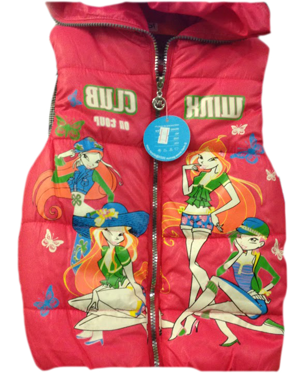 Модная стеганая жилетка для девочки, утепленная синтепоном. Изделие выполнено в красном цвете с большим принтом . Модель застегивается на молнию.