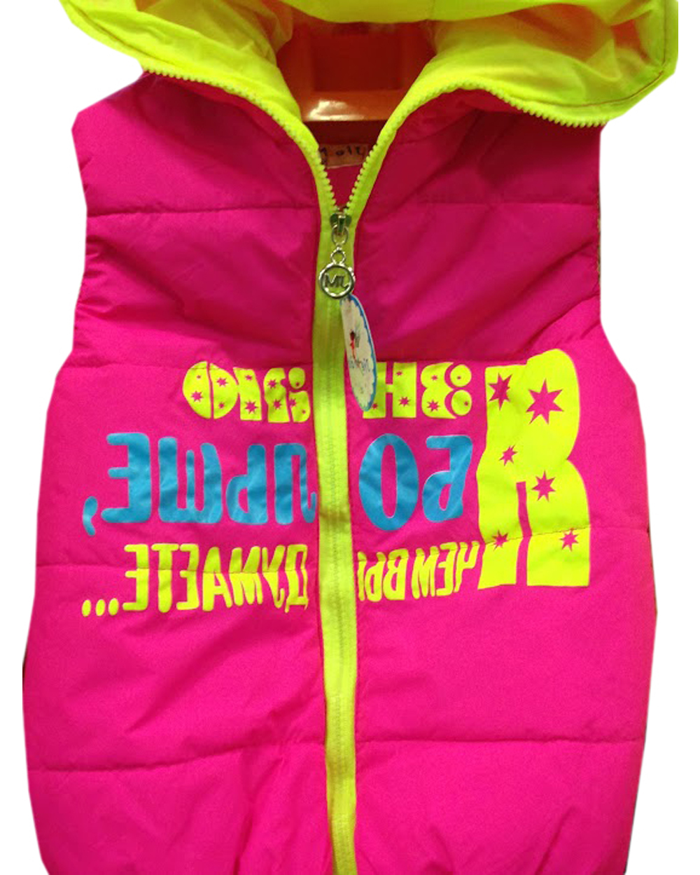 Красивая детская стеганая жилетка для девочки в возрасте от 3 до 7 лет. Модель выполнена в ярком розовом цвете с нанесенным принтом и подкладкой желтого цвета. Застежка сделана в виде молнии. Имеется капюшон.