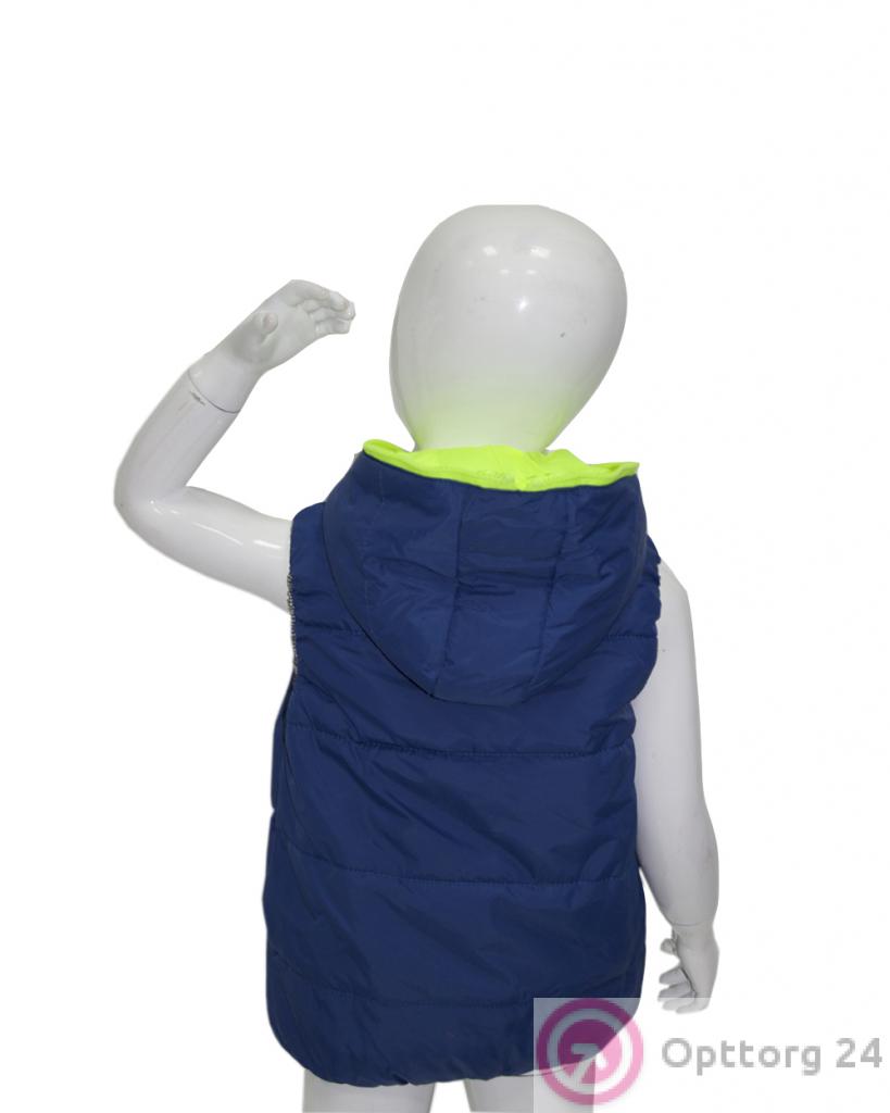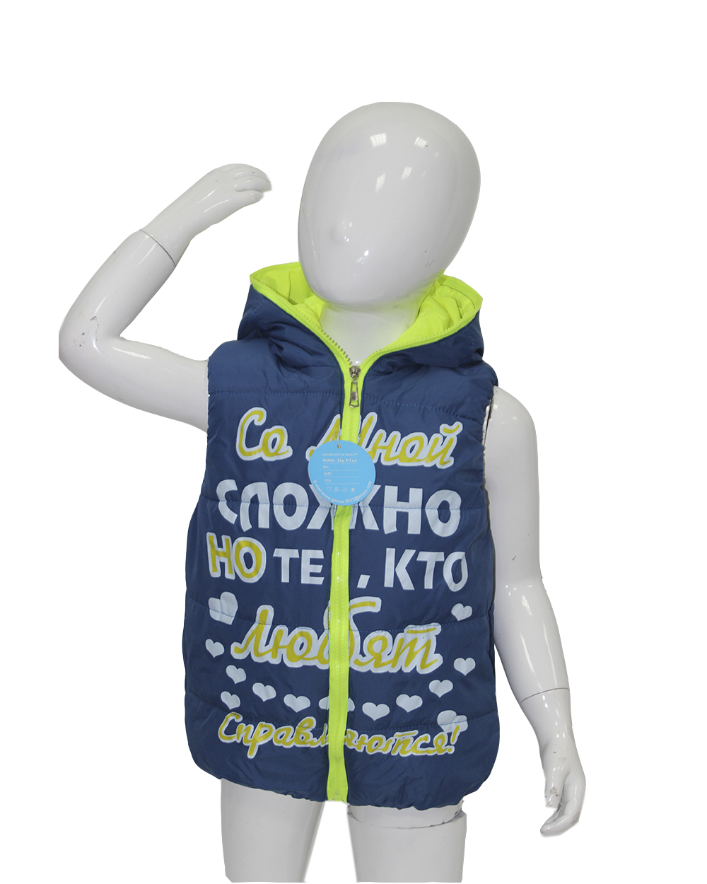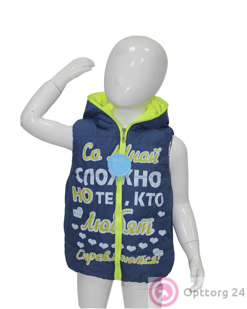 Теплый демисезонный детский жилет с капюшоном. В содели предусмотрена оригинальная надпись спереди. Застежка - молния, утеплитель - синтепон.