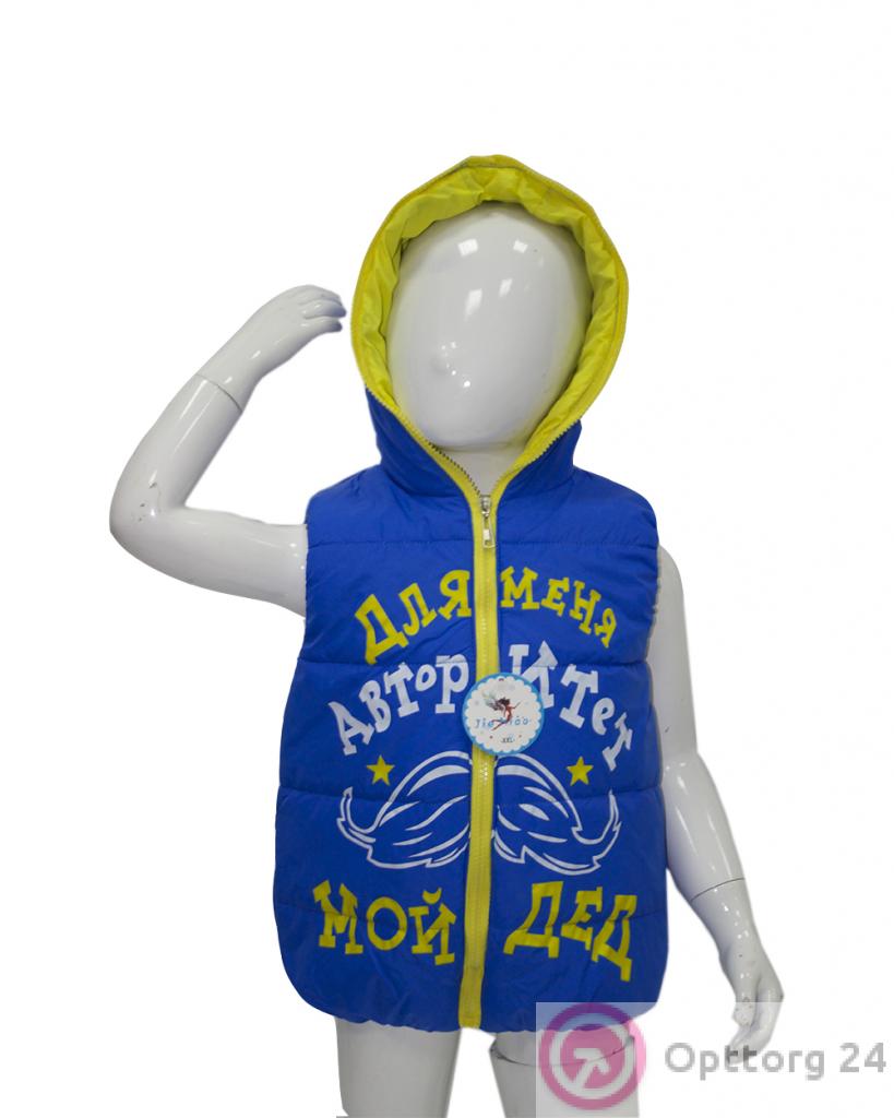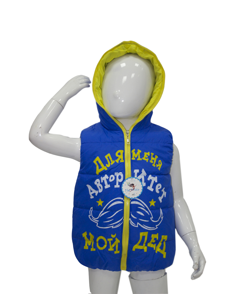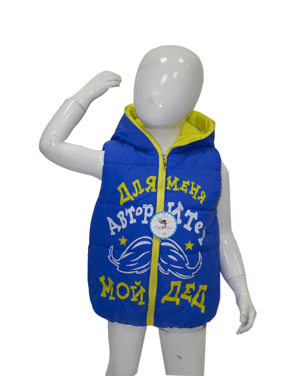 Теплая детская жилетка на синтепоне. Впереди изделие украшено оригинальной надписью. Застежка - молния.