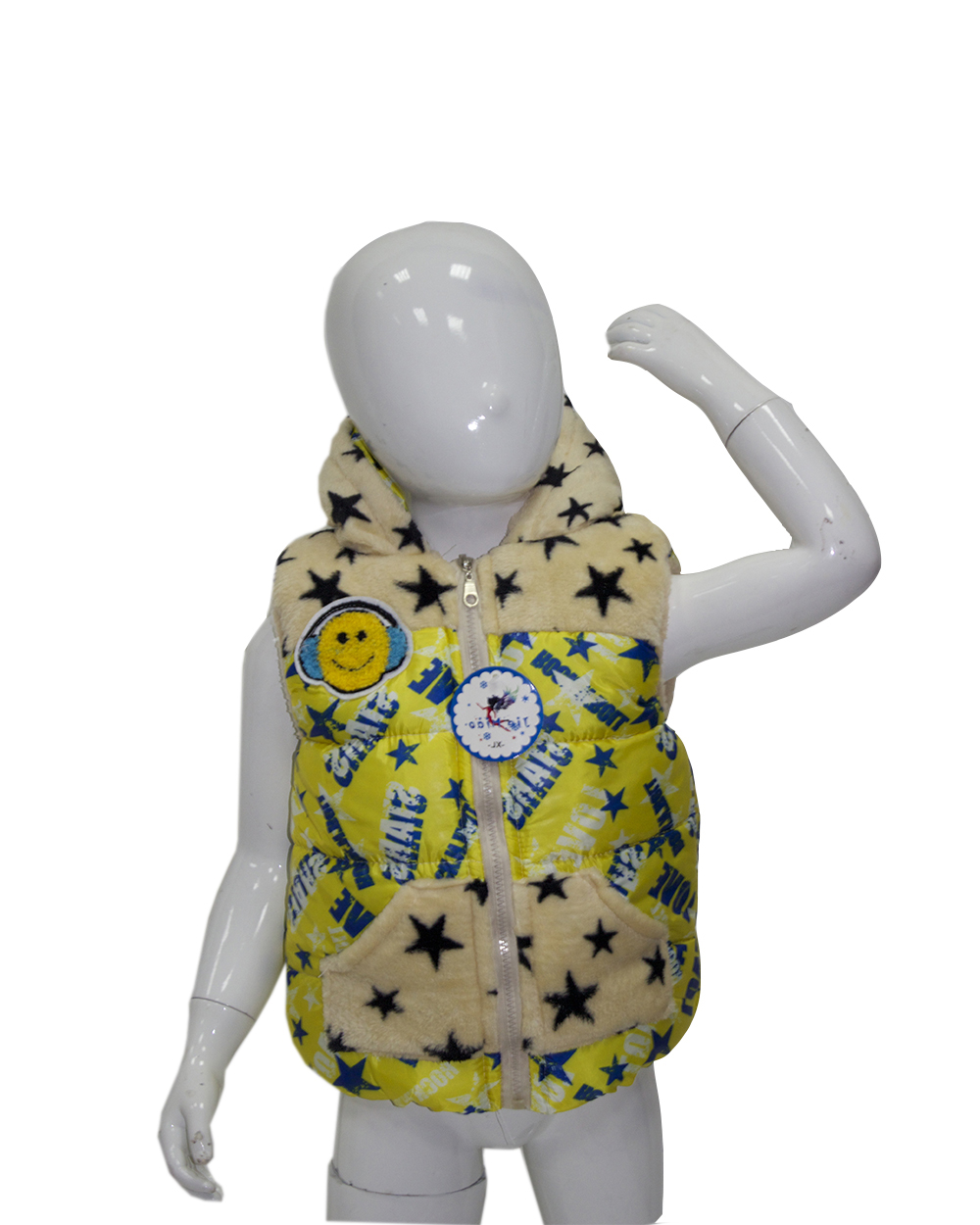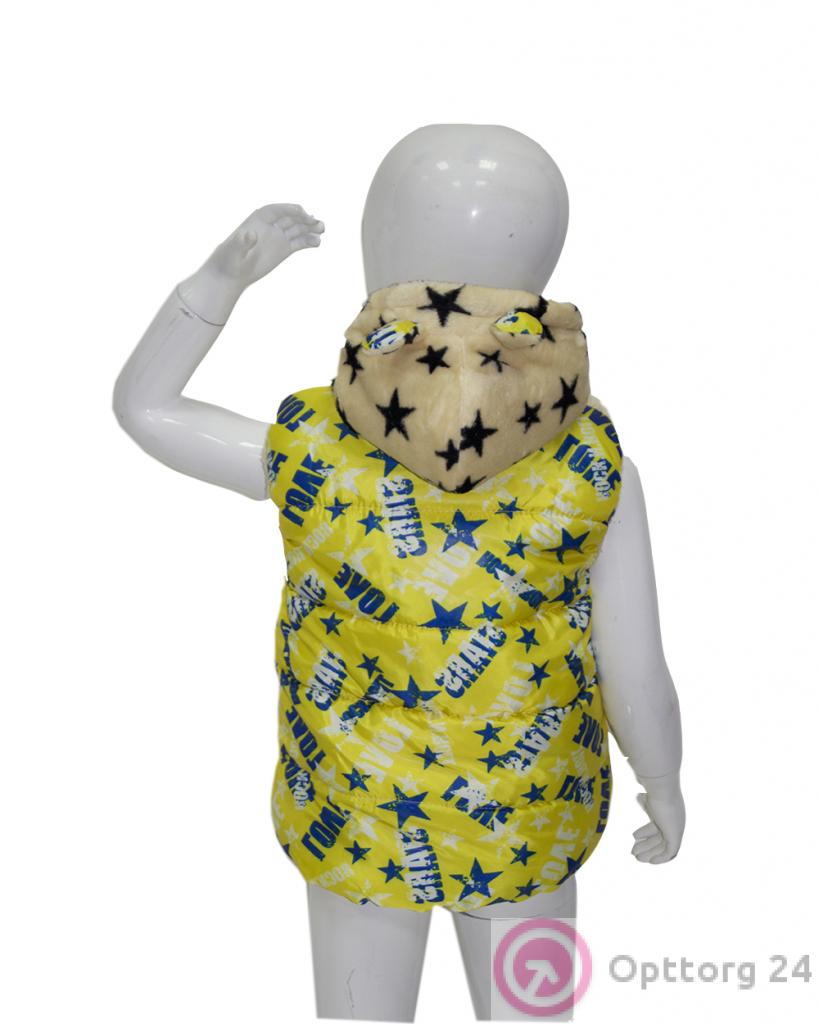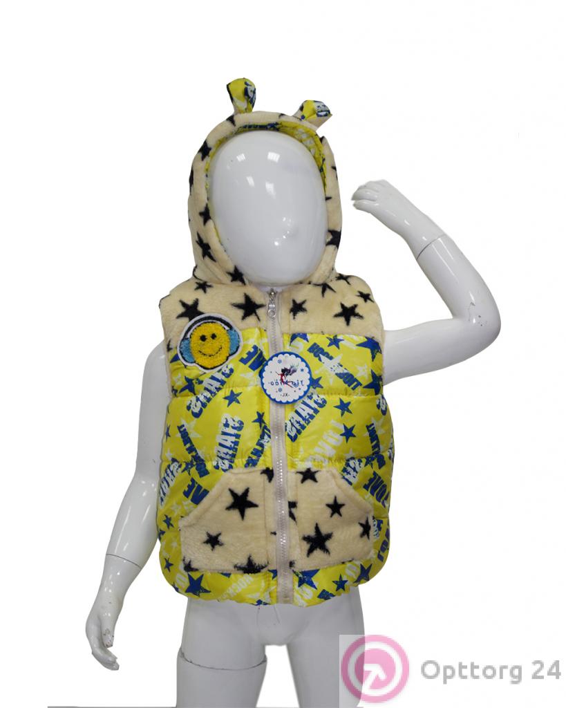 Веселая детская жилетка с махровыми вставками и капюшоном. Спереди изделие украшено оригинальной нашивкой в виде смайла. Модель застегивается на молнию.