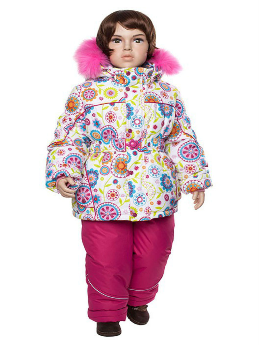 В комплект входит куртка с капюшоном,на котором расположен розовый мех, и полукомбинезон. На талии есть резинка.