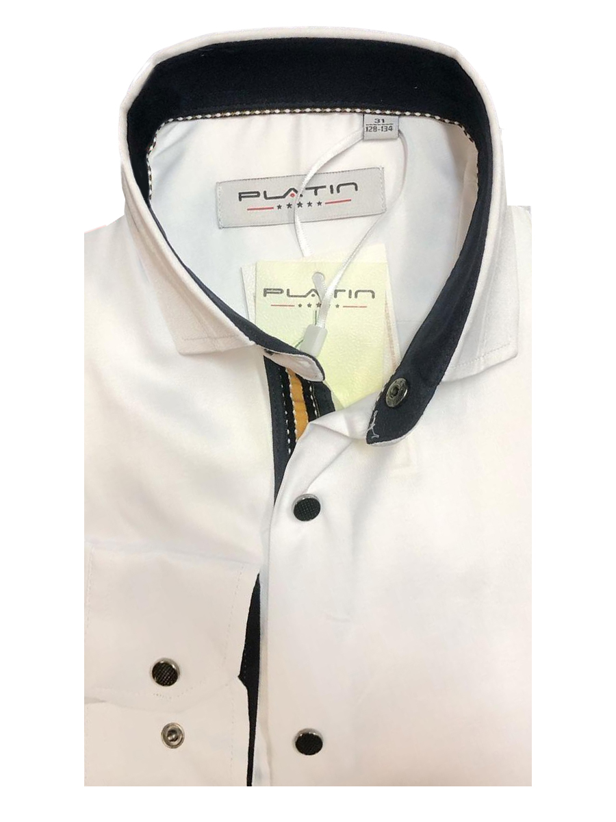 Описание: Рубашка мужская классическая Platin, идеально сочетается с костюмом, воротник стойка, белая с черной отделкой, прямого кроя, строгий, современный стиль, на кнопках с длинным рукавом.