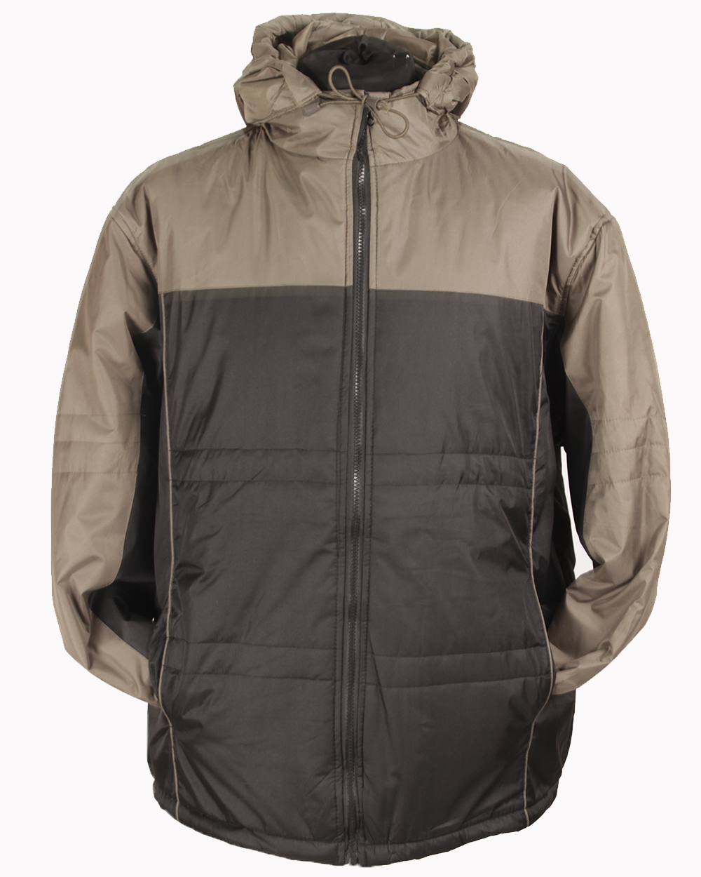 Мужской утеплённый пуховик темно зеленого цвета с серым верхом. синтепонавая подкладка.