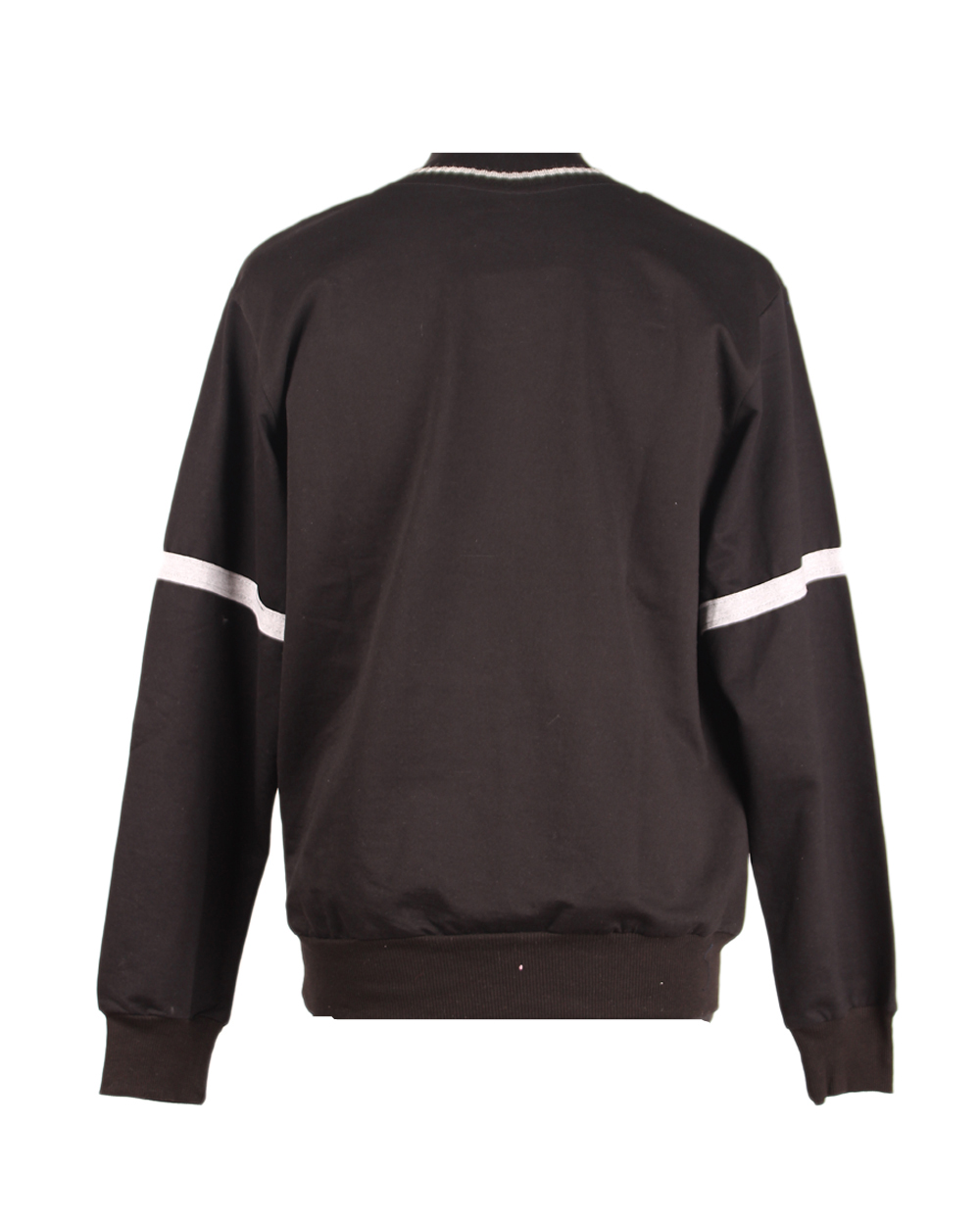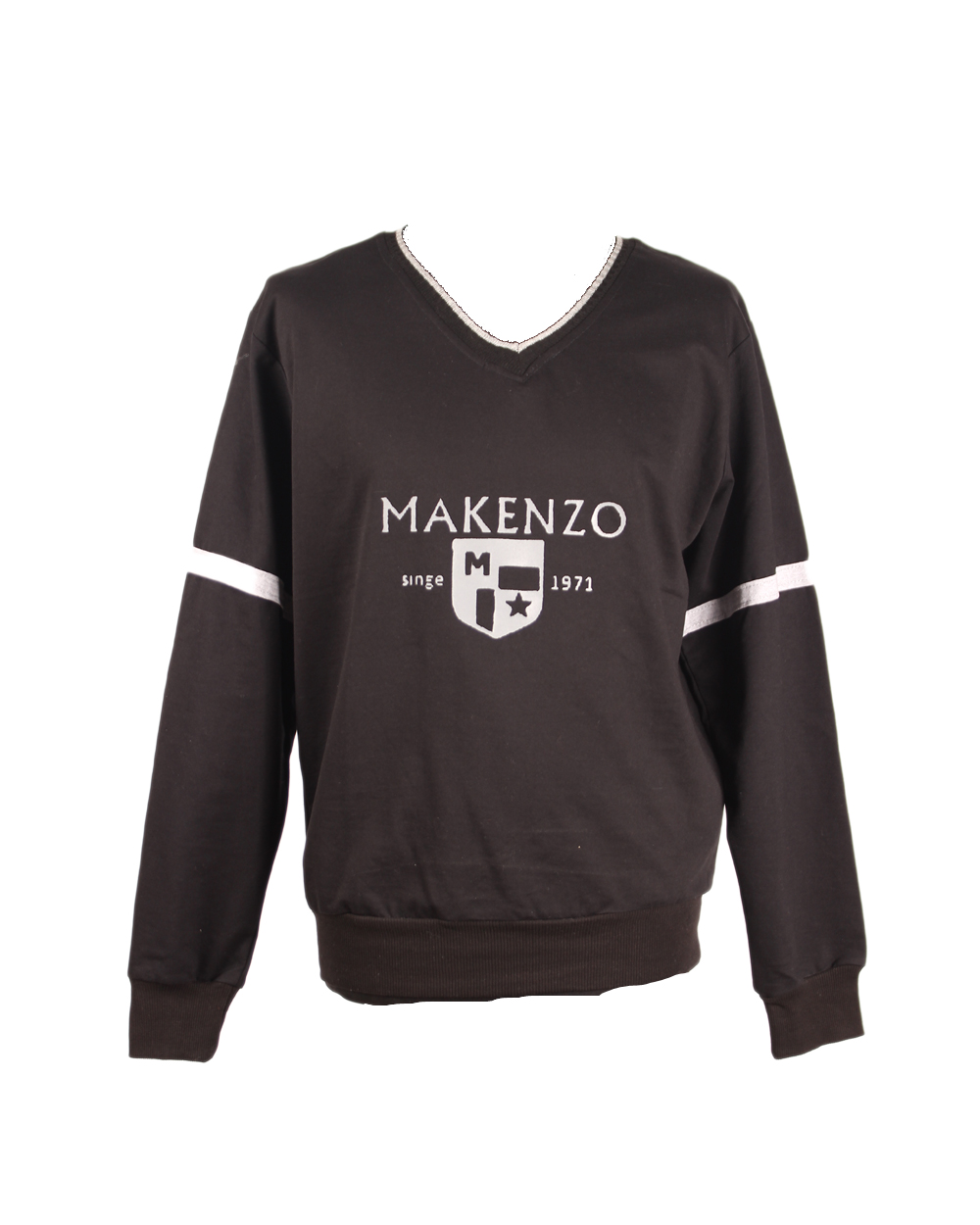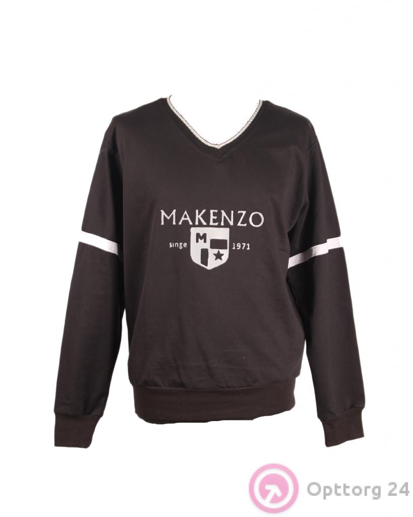 Красивый мужской акриловый джемпер черного цвета с белыми полосками на рукавах и большим логотипом Makenzo. V-образная горловина. Отличный вариант для каждодневной носки.