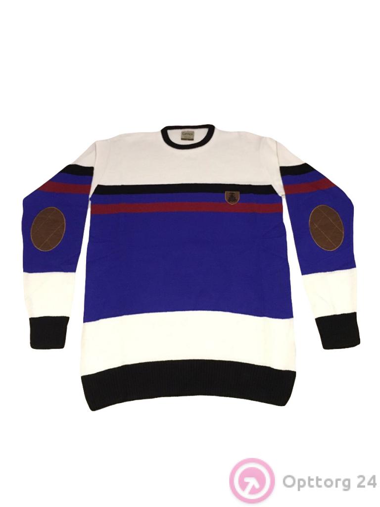 Джемпер мужской бело-синего цвета с бордовой полосой. Модель имеет округлый ворот, а так же располагает коричневыми нашивками в области локтей.