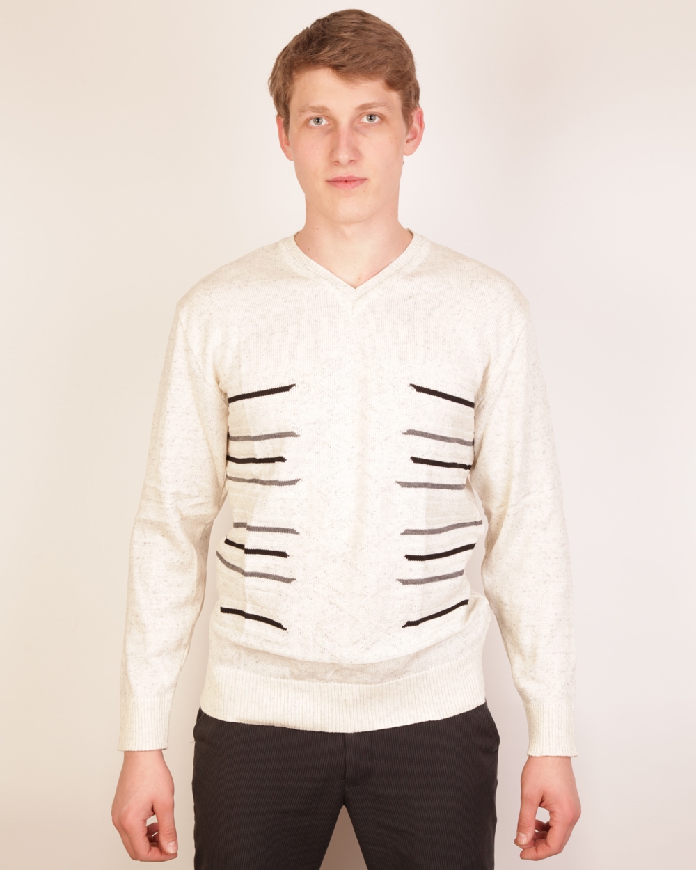 Джемпер бежевого цвета с оригинальными полосками по бокам станет отличным вариантом для ежедневной носки. Он сделан из качественного акрила и хлопка, поэтому обладает термоустойчивостью и легкостью. Джемпер можно свободно комбинировать с джинсами или брюками.