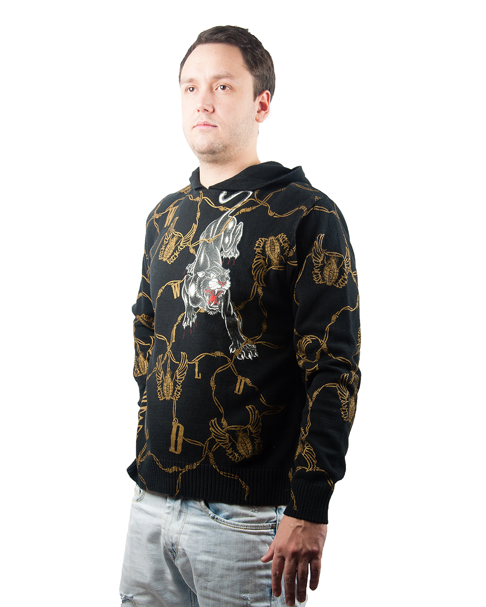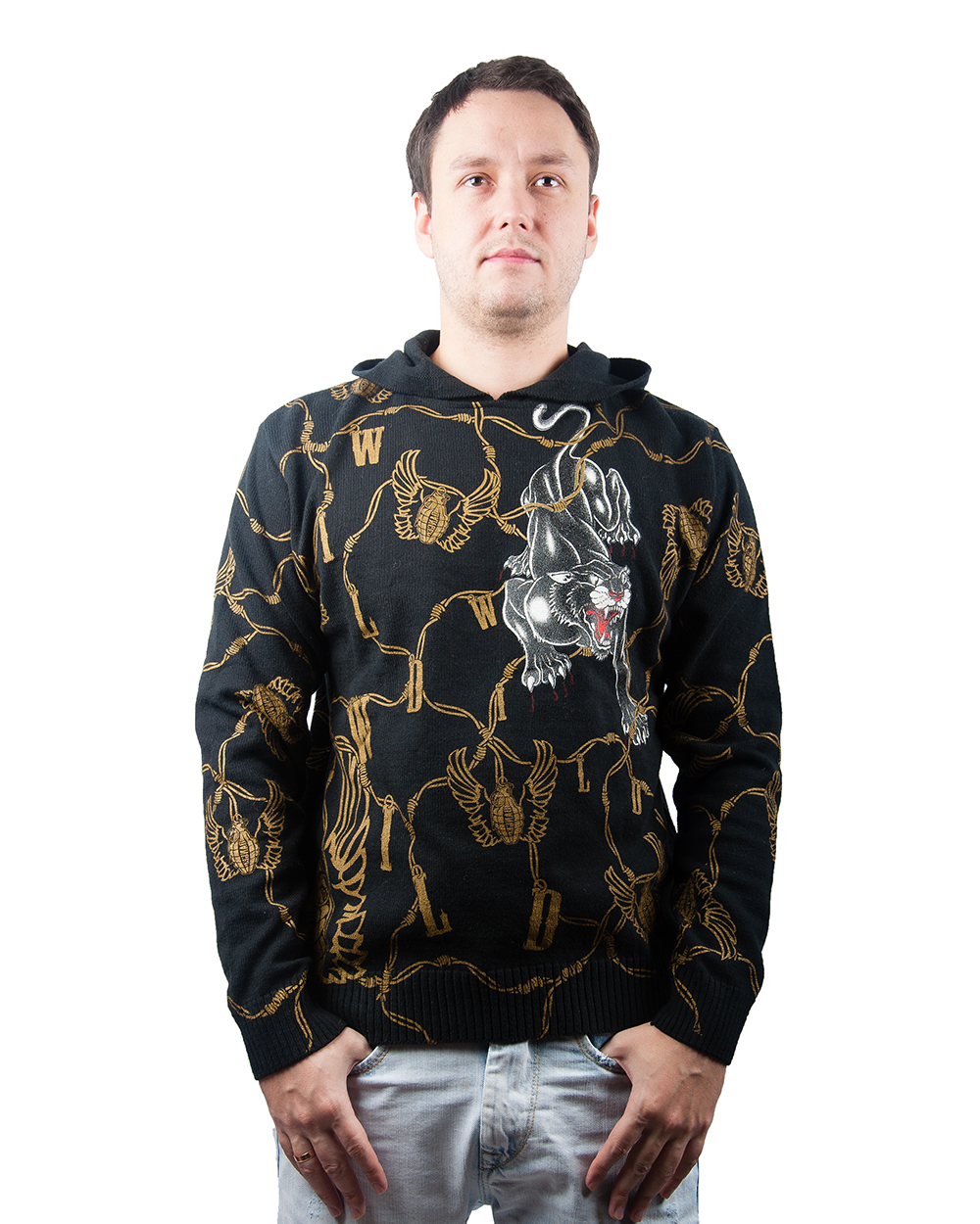 Мужчины, которые считают себя "королями стиля" и пользуются успехом у женщин, могут с уверенностью приобрести эту модель. Золотой узор с агрессивно-брутальным принтом крадущегося тигра замечательно смотрится на джемпере, а тканевый состав из нежного хлопка приятно облегает тело.