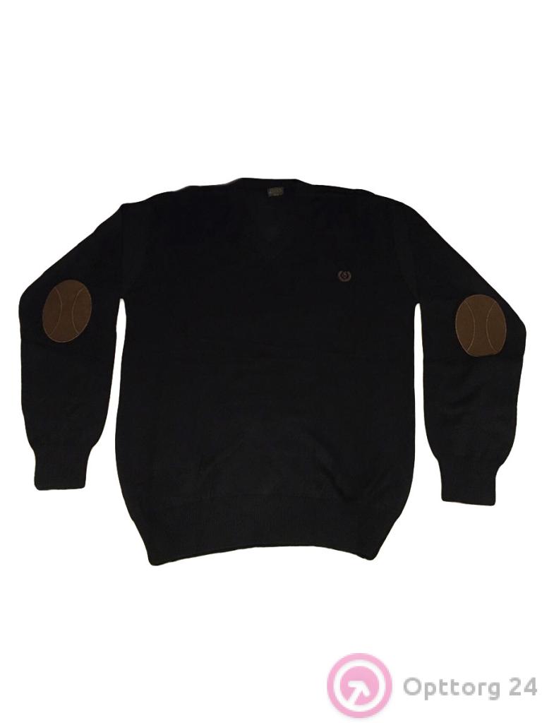 Джемпер мужской чёрного цвета с длинным рукавом. Модель имеет V-образный ворот, а так же нашивки коричневого цвета в области локтей.
