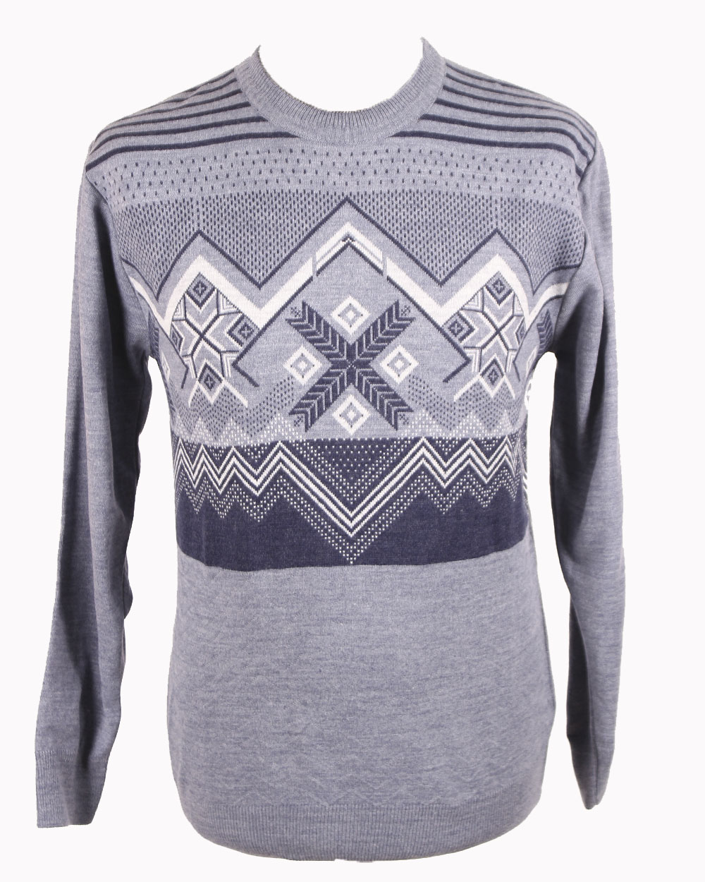 Джемпер голубого цвета, модель с плотной вязкой. на груди изделия расположен рисунок в виде кривых линий.