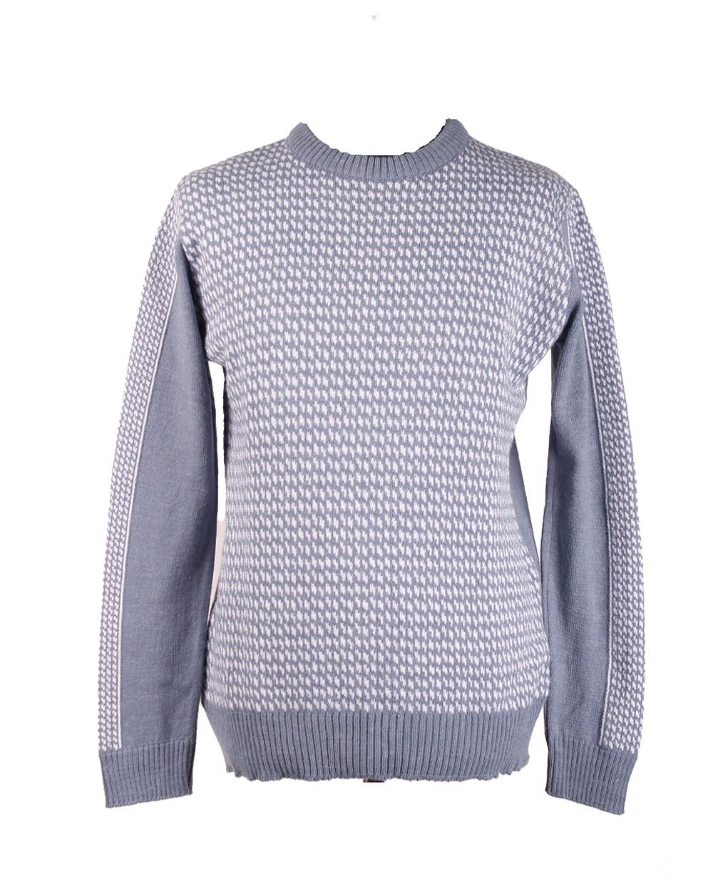Красивый мужской вязаный джемпер из шерсти голубого цвета с передом в мелкие ромбики белого цвета. Горловина имеет округлую форму, рукава и низ на резинке.