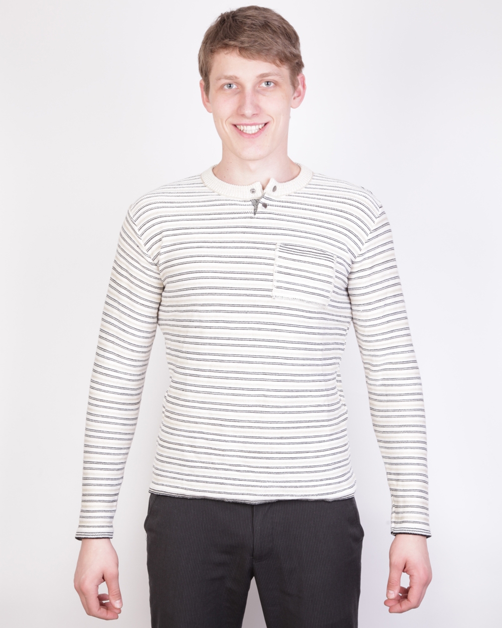 Аккуратный джемпер кремового цвета будет очень выгодно смотреться на мужчинах высокого роста. Удобная застежка на воротничке легко расстегивается и застегивается, а полоски украшают джемпер, придавая ему изысканный и необычный вид.