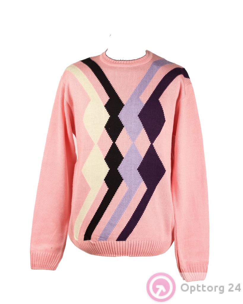 Стильный муской джемпер из акрила розового цвета с оранментом в виде больших цветных ромбов. Округлая горловина, низ и рукава модели дополнены резинками. Джемпер очень мягкий и теплый. Не разтягивается при носке.