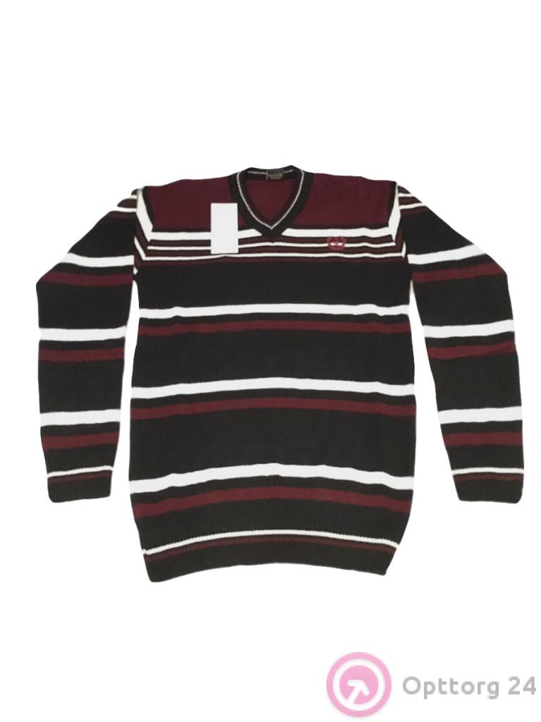 Мужской джемпер с длинным рукавом, чёрно-бордового цвета в белую полоску. Модель с V-образной горловиной.