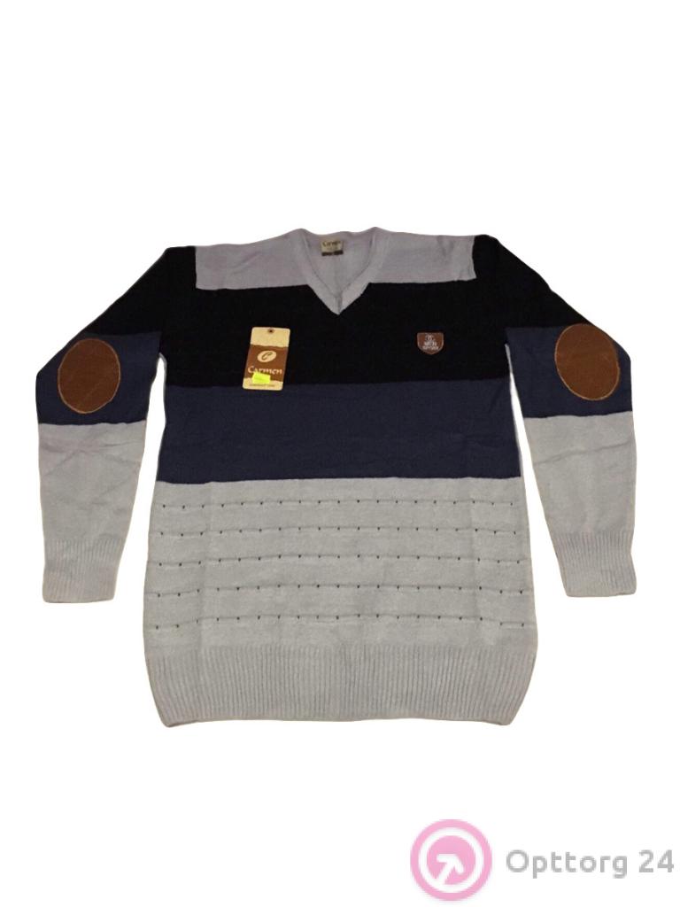 Джемпер мужской светло-серого цвета с чёрно синей полосой. Модель имеет длинный рукав, а так же располагает нашивками коричневого цвета в области локтей и имеет V-обзный ворот.
