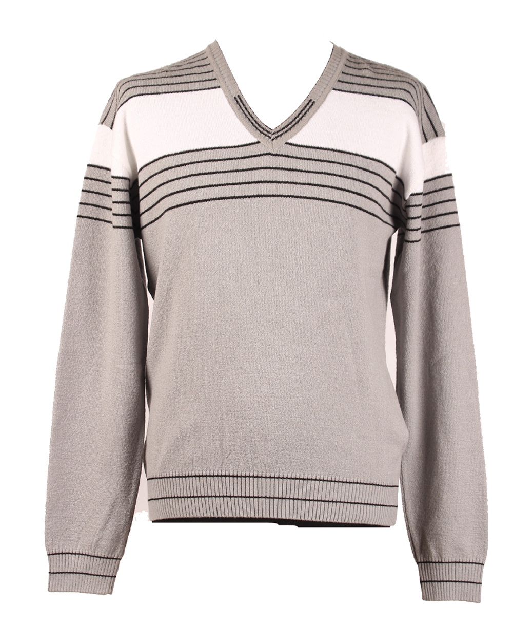 Удобный и практичный джемпер серого цвета с широкой белого цвета. Модель выполнена из шерсти. Не теряет форму после стирки. Горловина V-образная.