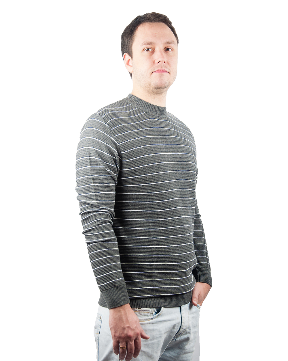 Серый джемпер с оригинальными полосками прекрасно сочетается с повседневными джинсами, а также подходит к строгим классическим брюкам. Приятная ткань, состоящая из натуральной шерсти и хлопка приятно касается тела, создавая ощущение комфорта и защищенности.