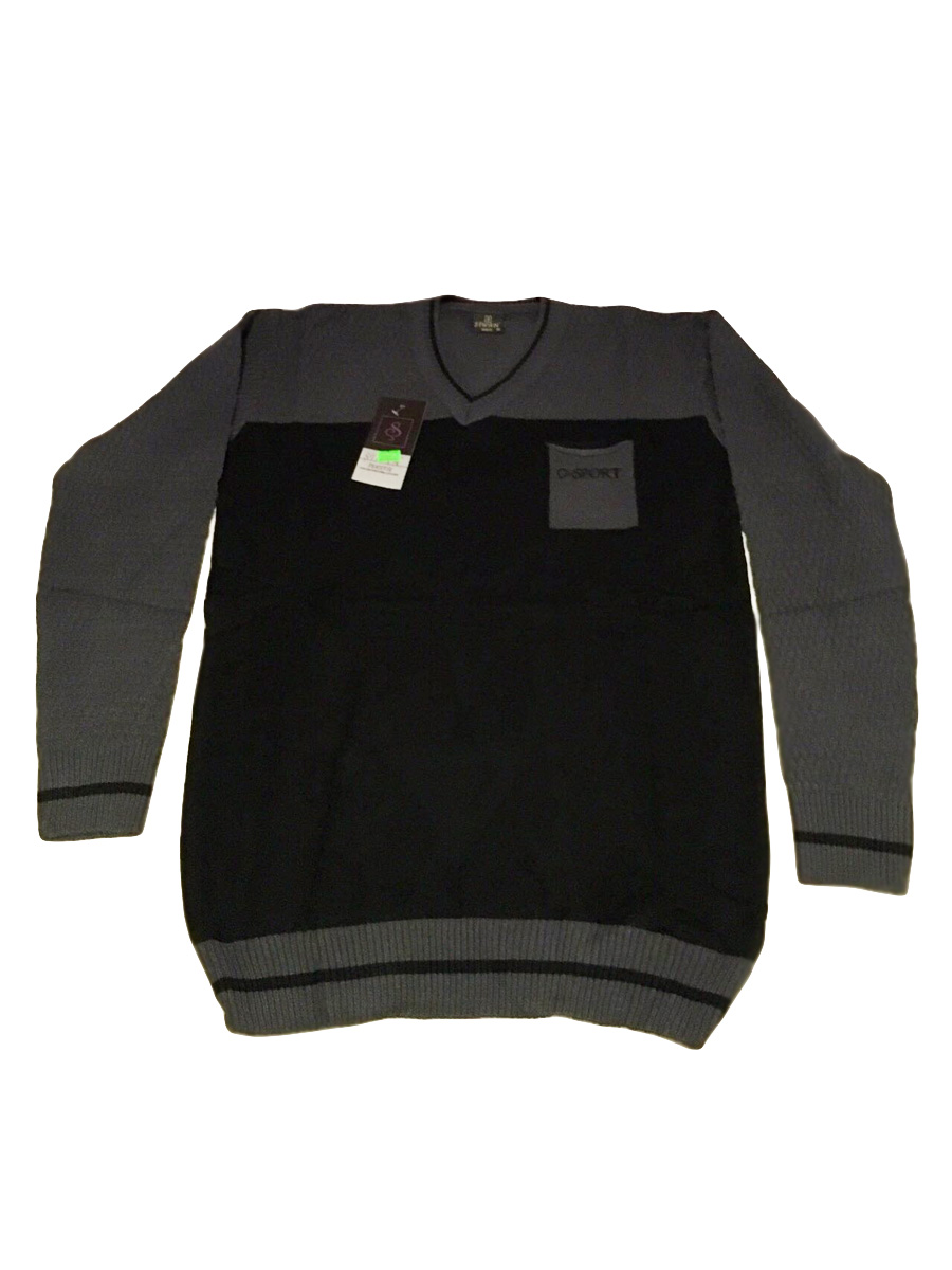 Классический мужской джемпер чёрно-серого цвета с длинным рукавом. Модель с V-образным воротом и имеет карман серого цвета в области груди.