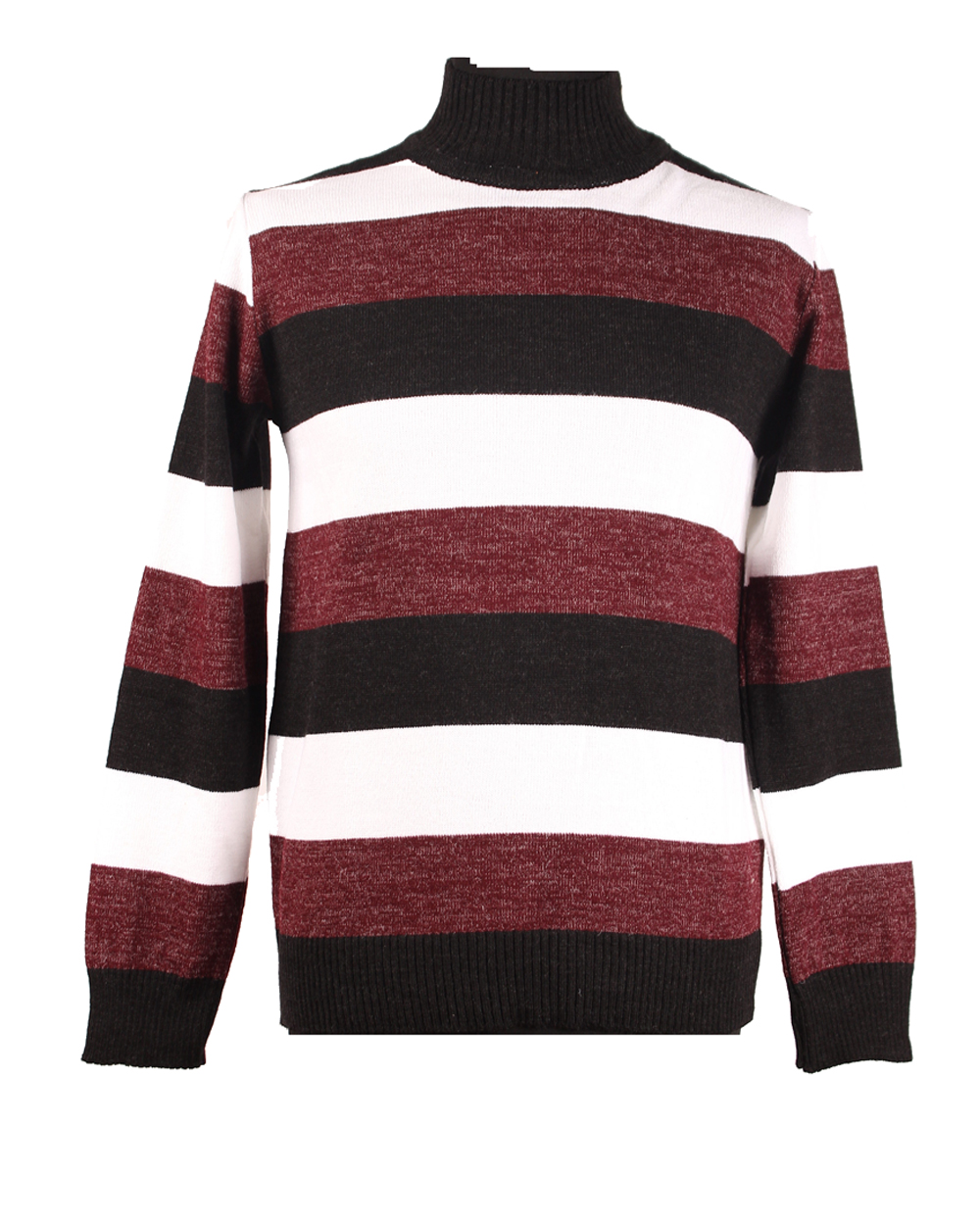 Вязаный шерстяной джемпер с воротником под шею. Модель в белую, коричневую и черную горизонтальную полоску. Воротник, рукава и низ изделия отделаны вязаной эластичной резинкой. Наличие шерсти в составе делает джемпер очень теплым и приятным на ощупь.