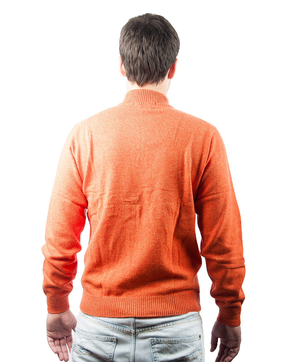 Выразительный джемпер оранжевого цвета с короткой молнией на груди связан из натуральной шерсти. Он согреет вас зимой и подойдет для носки даже под тонкой курткой. Геометрические комбинации придают модели пикантность и легкость.