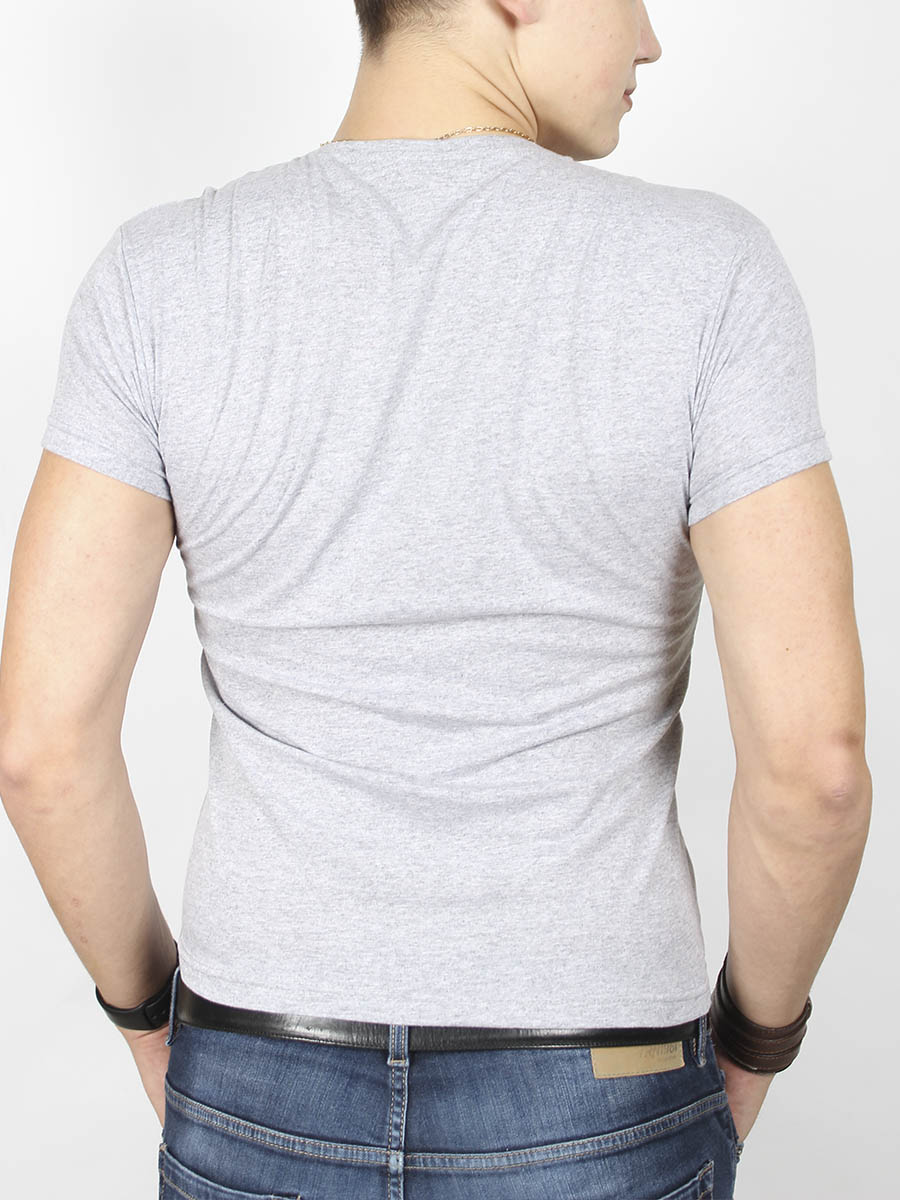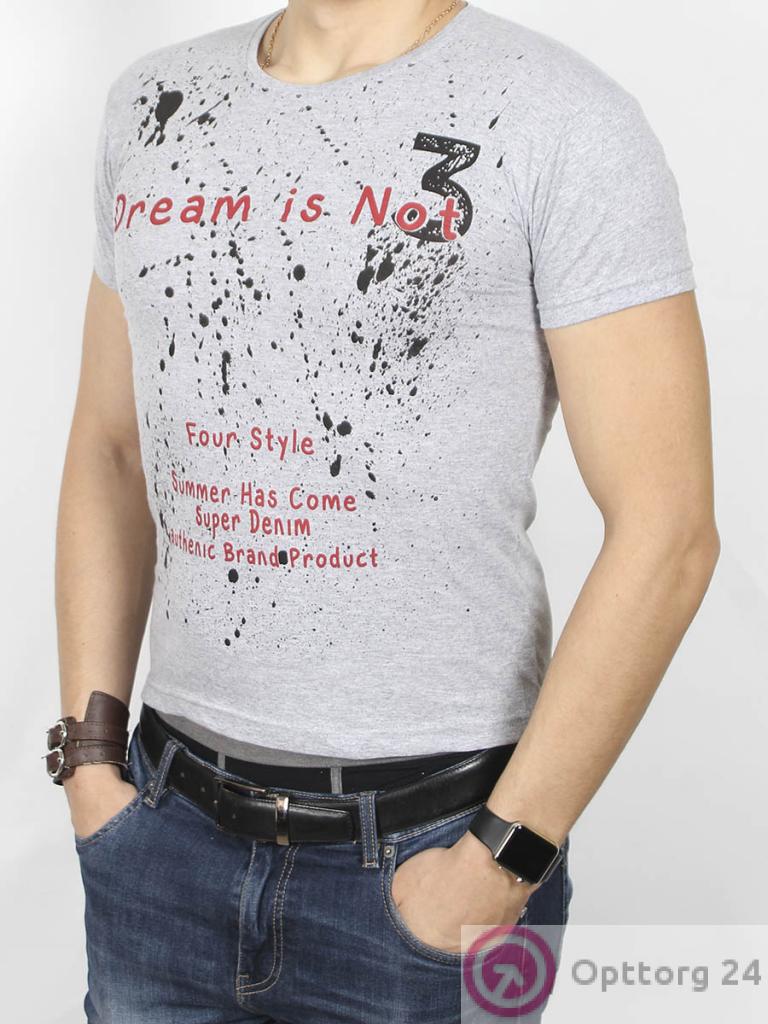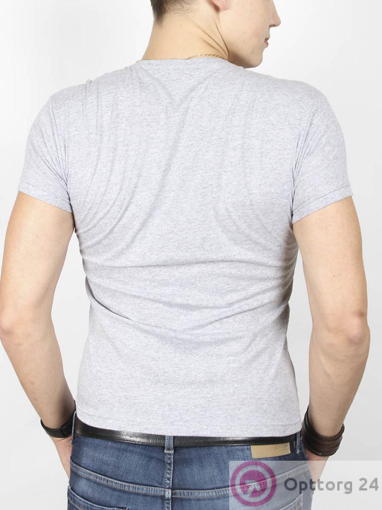 Футболка мужская нейтрального серого цвета с принтом на епередней части изделия.