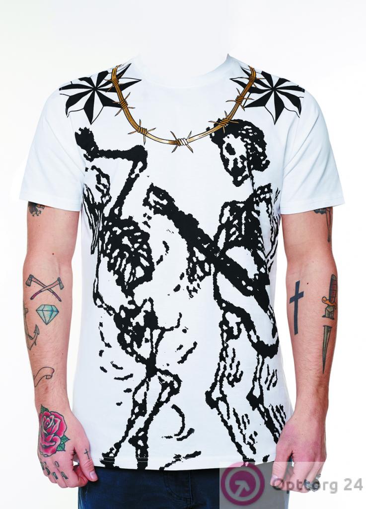 Оригинальная мужская футболка с необычным принтом. На футболке изображены два скелета, один из которых играет на гитаре и колючая проволока. Очень стильная молодежная вещь