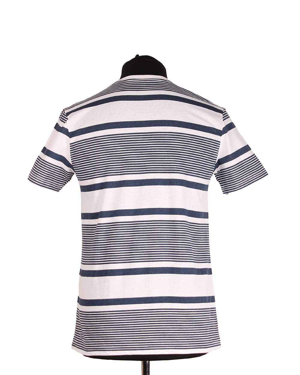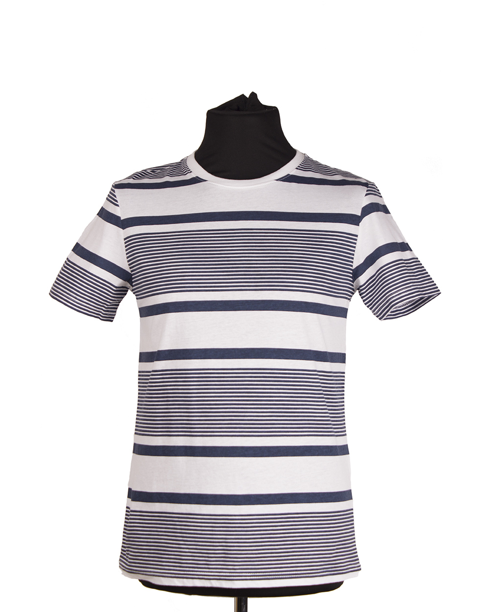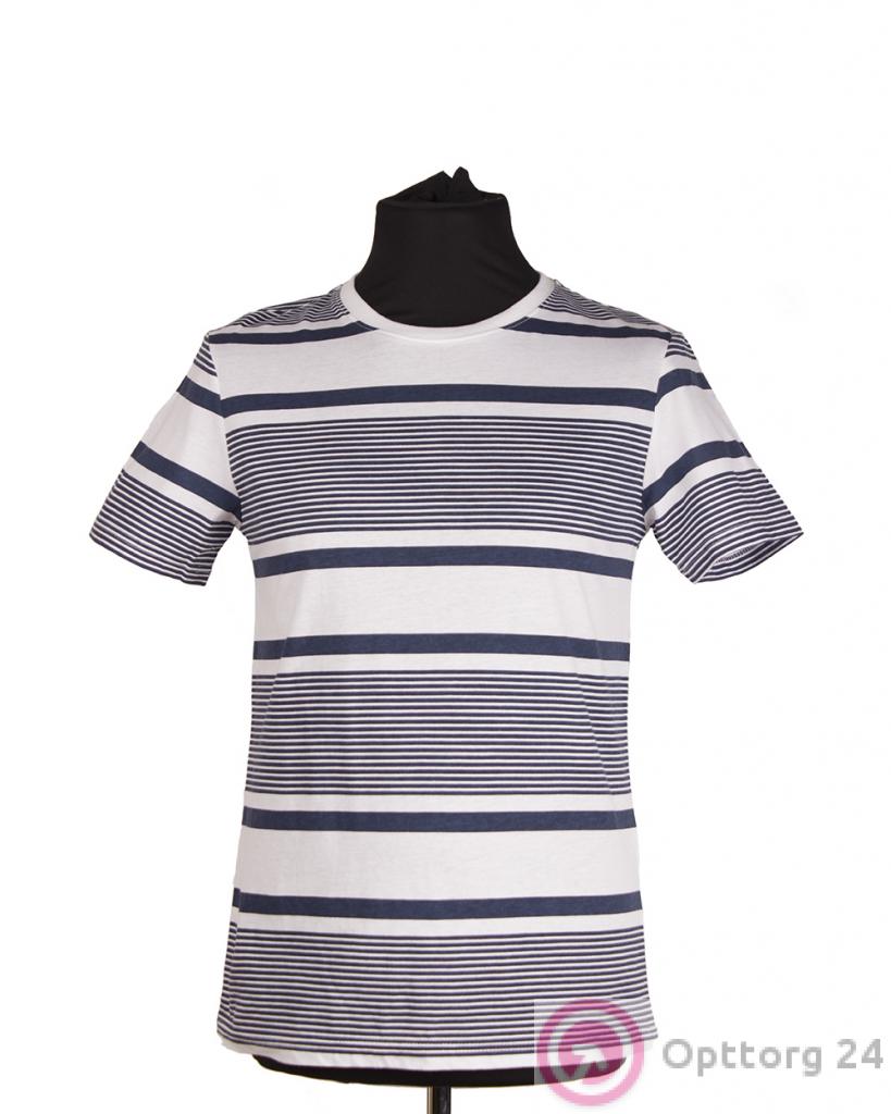 Стоковая футболка отличного качества из Англии. Модель белого цвета с горизонтальныи полосками темно-синего цвета разной ширины. Футболка очень приятная на ощупь, не парит и не теряет своей формы после носки.