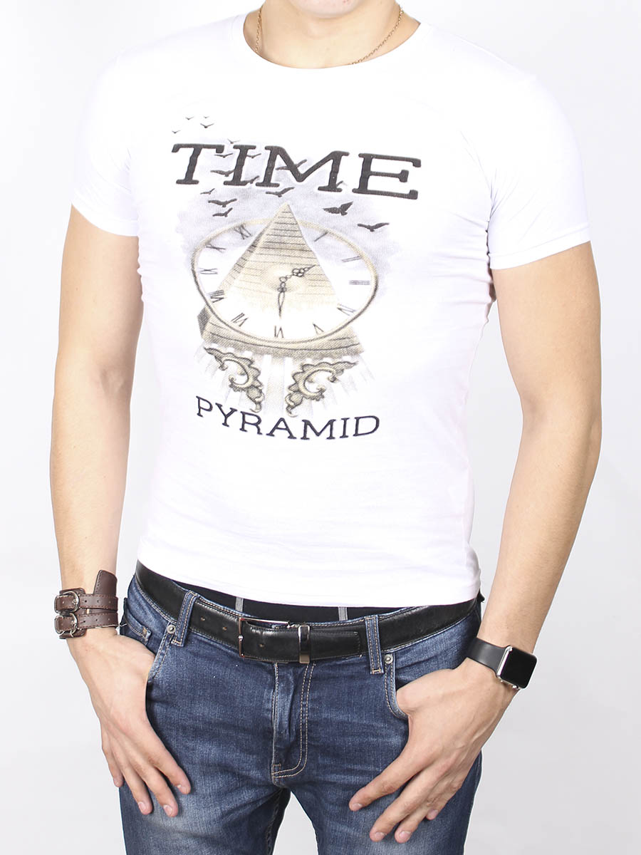 Мужская футболкая белого цвета с принтом в виде пирамиды на передней части изделия.