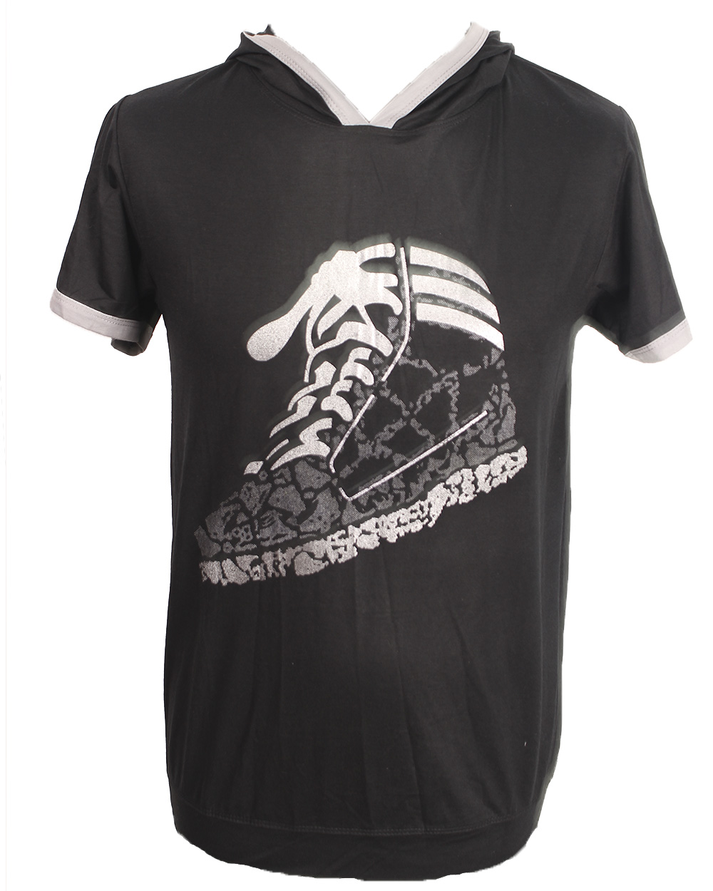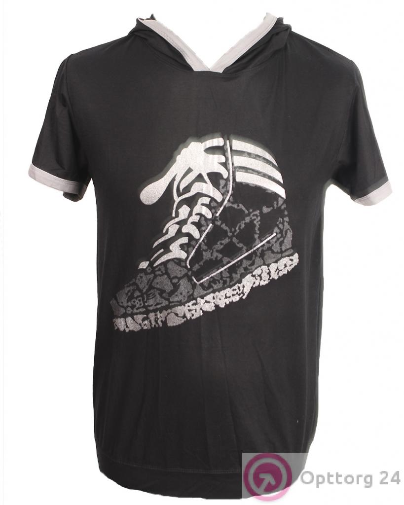 Мужская футболка черного цвета, с принтом в виде кросовка. Модель с капюшоном и серой окантовкой на рукавах и воротнике модели.