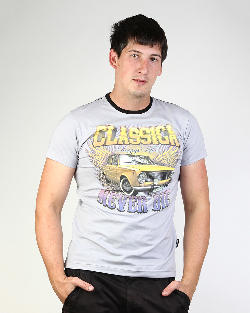 Футболка необычного серого цвета с ярким принтом. Подойдет для повседневной носки, а также для особенных случаев. Выполнена из натурального хлопка.