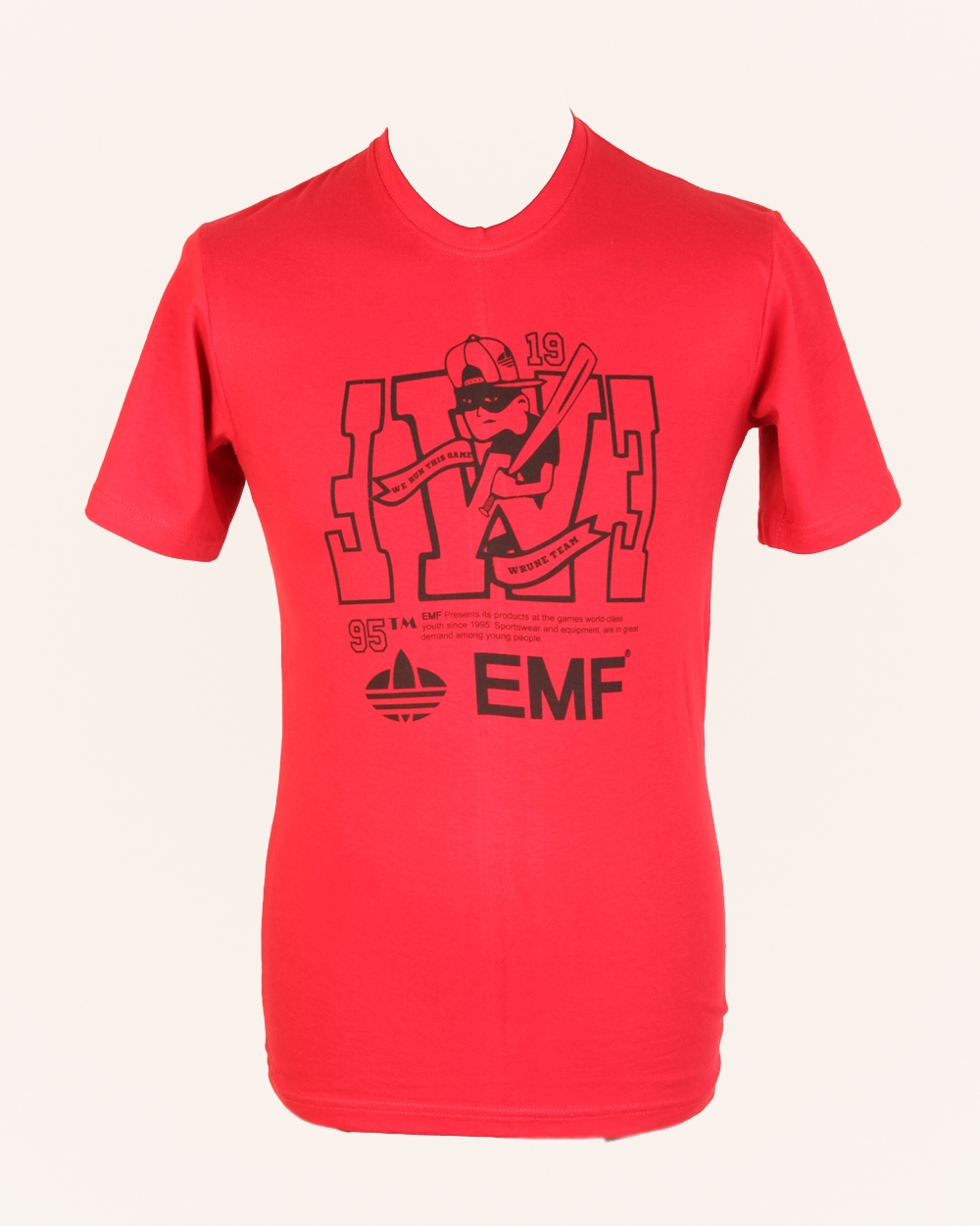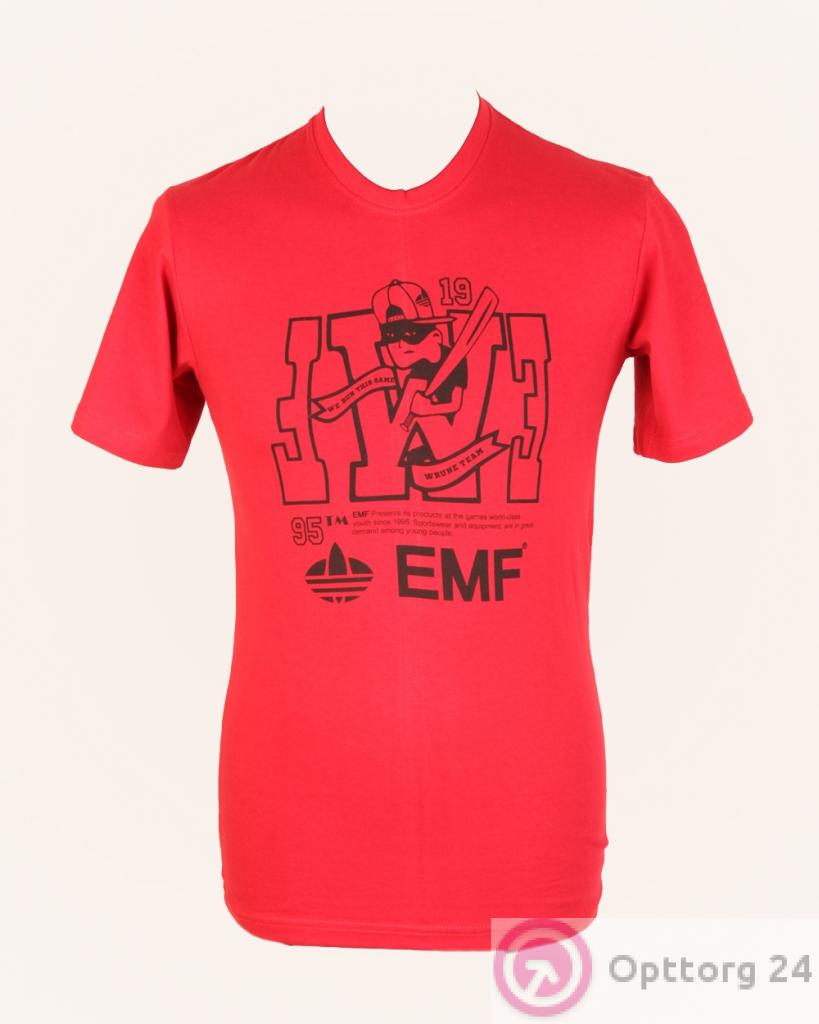 Яркая мужская футболка выразительного красного цвета оснащена оригинальным принтом. Модель с короткими рукавами, выполнена из легкого хлопка и приятного эластана.