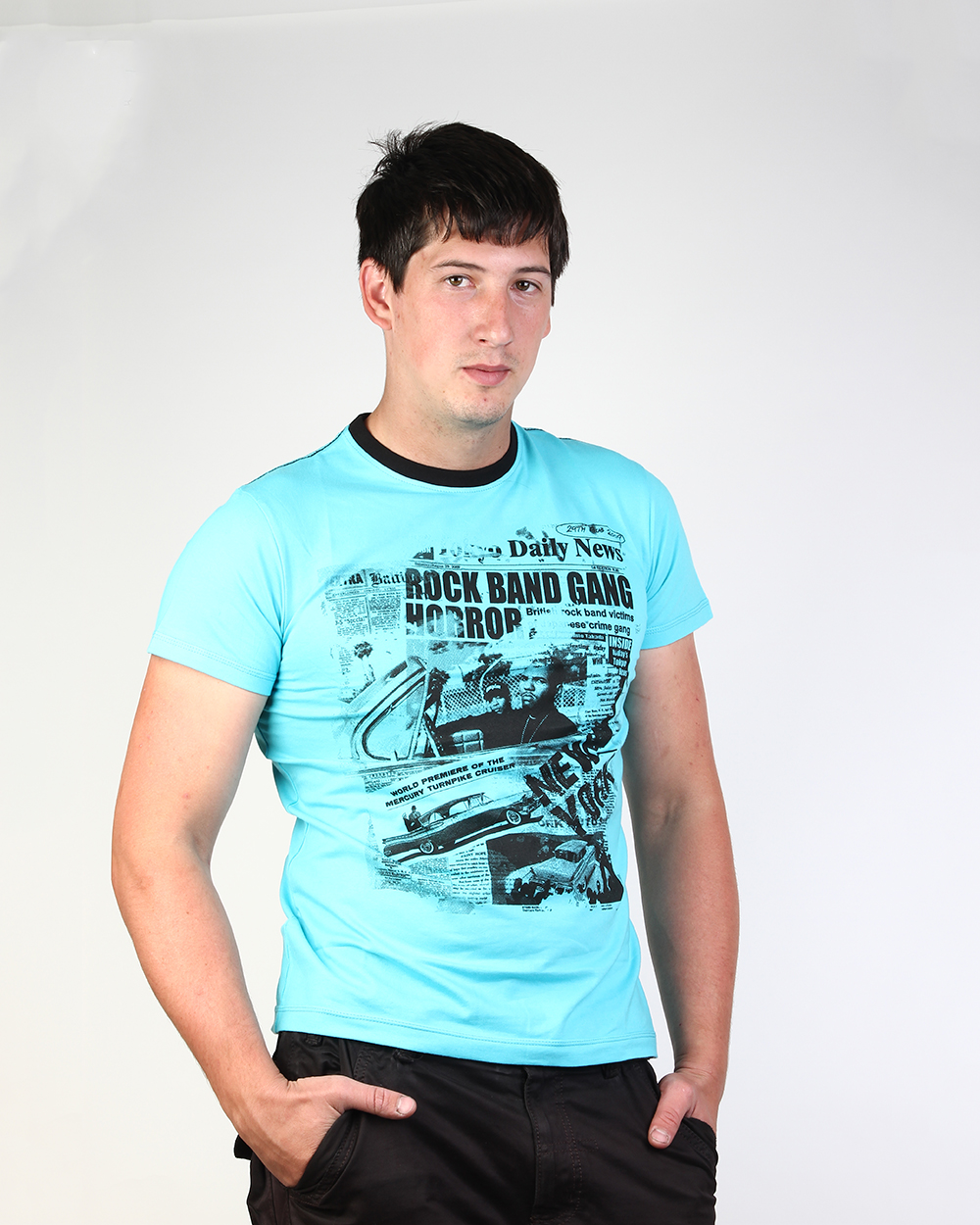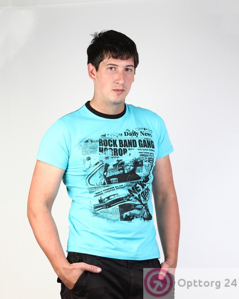 Футболка мужская с газетным принтом голубая оптом